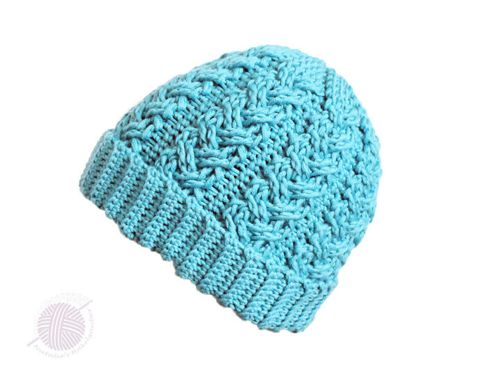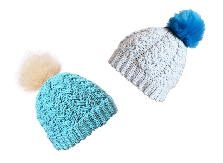 Es wird erklärt: Material, Berechnung der Größen von 44 bis 62 cm (KU), Rand, Mitte, Spitze der Mütze, Zopfmuster, Bommel, Häkelschrift + Video für das Zopfmuster.