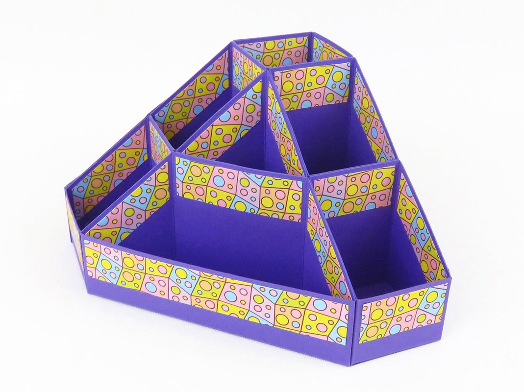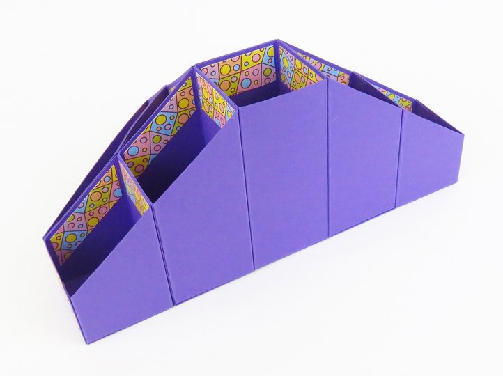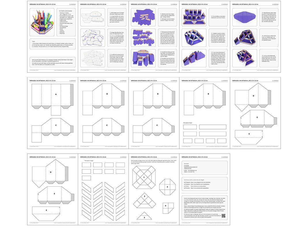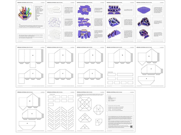 Dieser hier bietet sogar noch mehr Optionen: Nach denselben Vorlagen können weitere Haltervarianten gebastelt werden z. B. mit mehr oder mit weniger Fächern oder solche, die sich perfekt für eine Ecke eignen. Bei den Produktfotos siehst du räumliche Zeichnungen für ein paar weitere Varianten und bei den Vorlagen gibt es eine schematische Darstellung dafür.