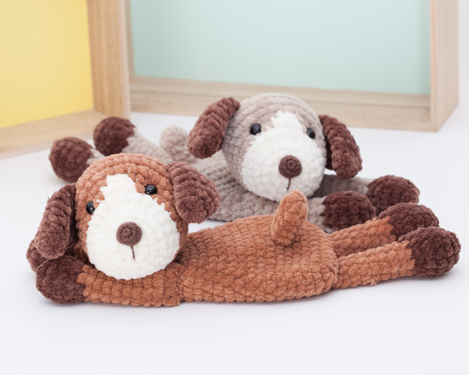 Wenn Du dasselbe Garn und dieselbe Häkelnadel verwendest wie angegeben, wird der Schmusehund ca. 29,5 cm (11,4 Zoll) groß. Du kannst es größer oder kleiner machen, indem du ein anderes Garn benutzt, passe aber dann die Häkelnadel entsprechend an.