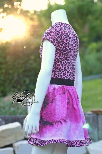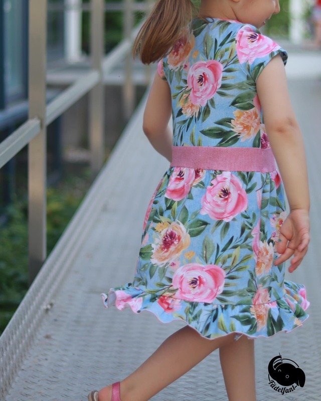 Der Halsausschnitt wird mit Beleg genäht. Der Rockteil wird ebenso gerafft wie der Abschluss unten – so zauberst du mit wenig Aufwand einen wundervollen Hingucker für die warmen Tage. Vom Nählevel her würde ich es als anfängertauglich einstufen, für die Variante mit den Paperbag-Ärmeln solltest du aber schon ein paar Näherfahrungen gesammelt haben.