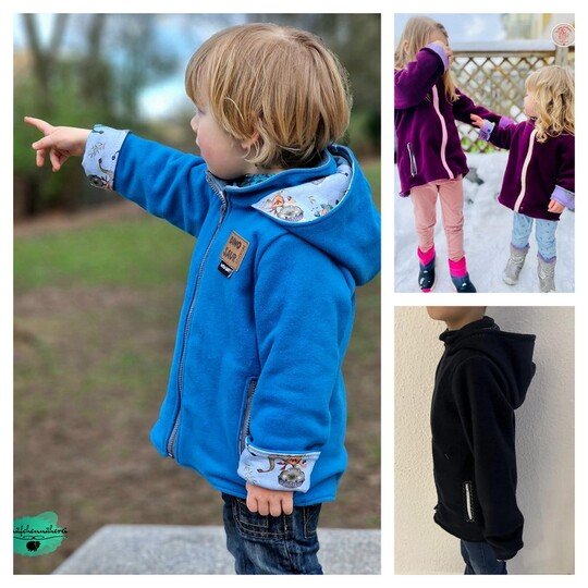 Sie kann aus Fleece, Alpenfleece oder anderen dicken kuscheligen Stoffen genäht werden – innen wird sie mit Jersey oder Sommersweat gefüttert.