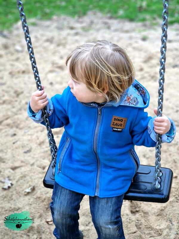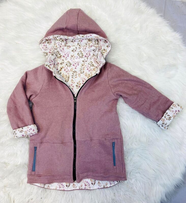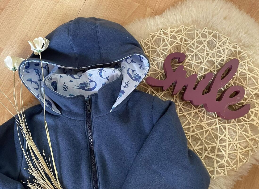 Die Ärmel werden umgeschlagen, sie fällt im Ganzen auch reichlich aus, sodass sie wirklich lang mitwächst. Geschlossen wird die Jacke mit einem Reißverschluss. Ebenso hast du Taschen mit Reißverschlüssen dabei, die du optional nähen kannst.