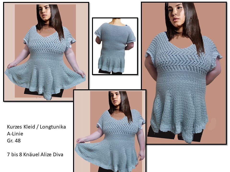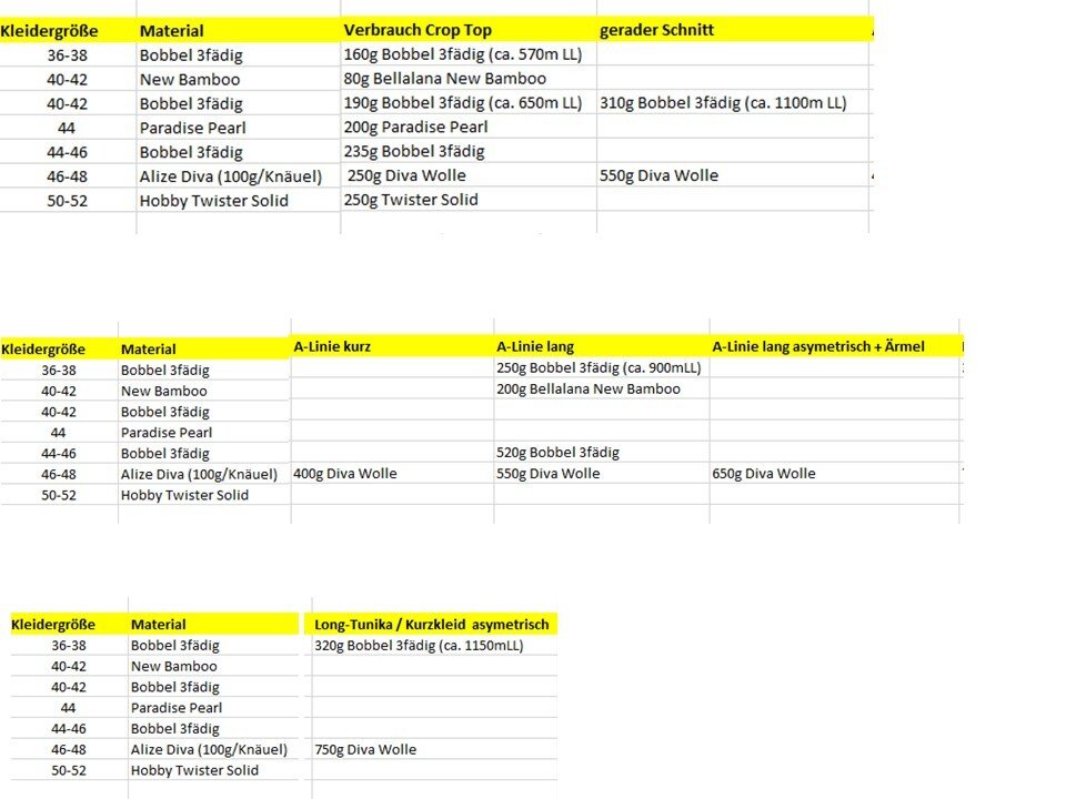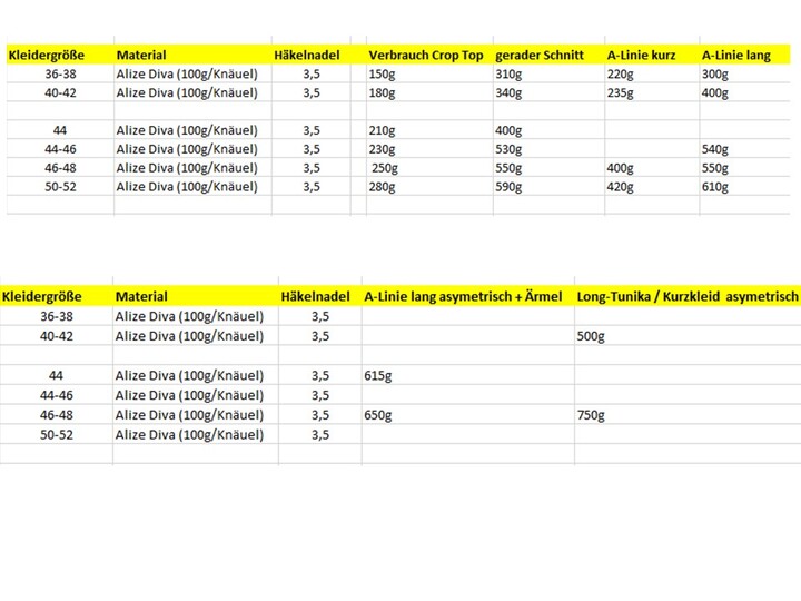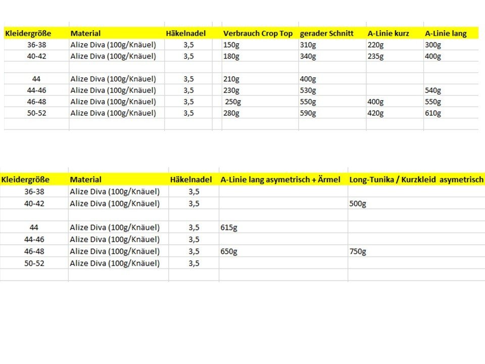 Je nach Kleidergröße und gewünschter Vriante benötigst Du 200 bis 900g Wolle. Garn für Häkelnadel 3,0 bis 3,5. Das Garn sollte nicht zu dick sein.