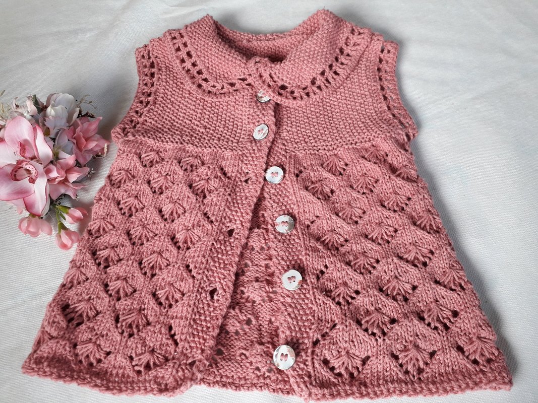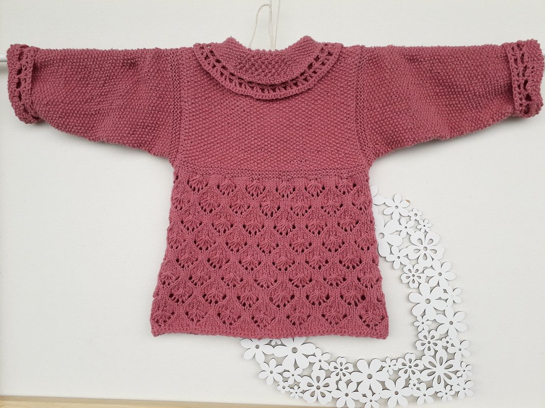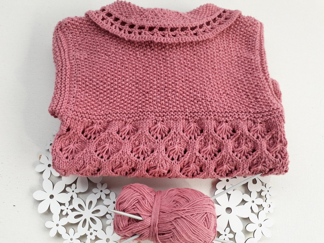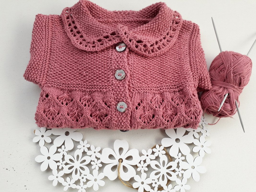 Hier bekommst du eine bis ins kleinste Detail erklärte 15-seitige Strickanleitung in deutscher Sprache mit Maßskizze für eine süße Babyjacke aus reiner Baumwolle für kleine Prinzessinnen passend für Größe 80-86.