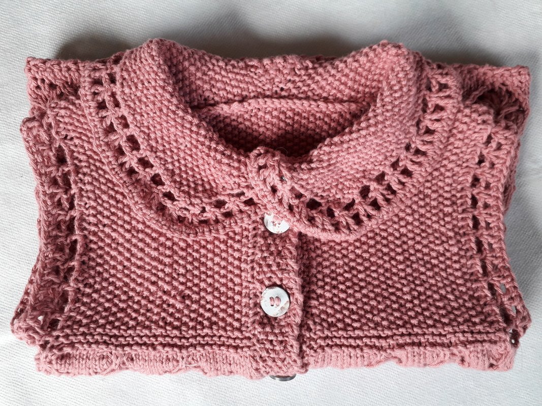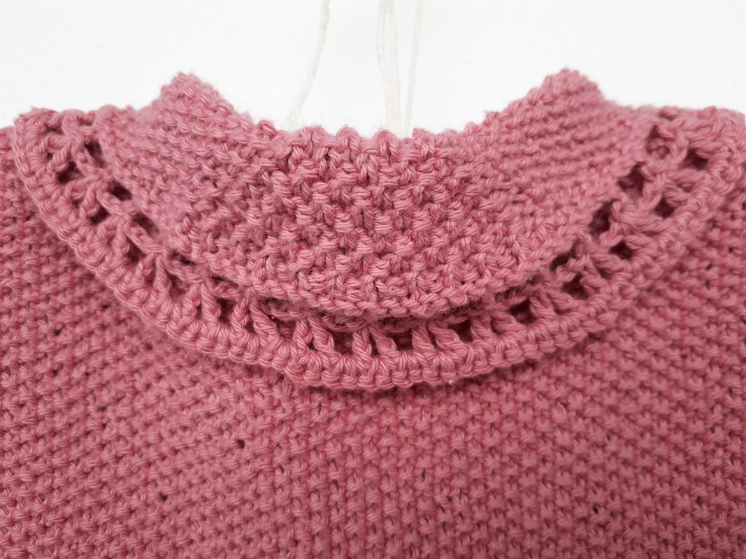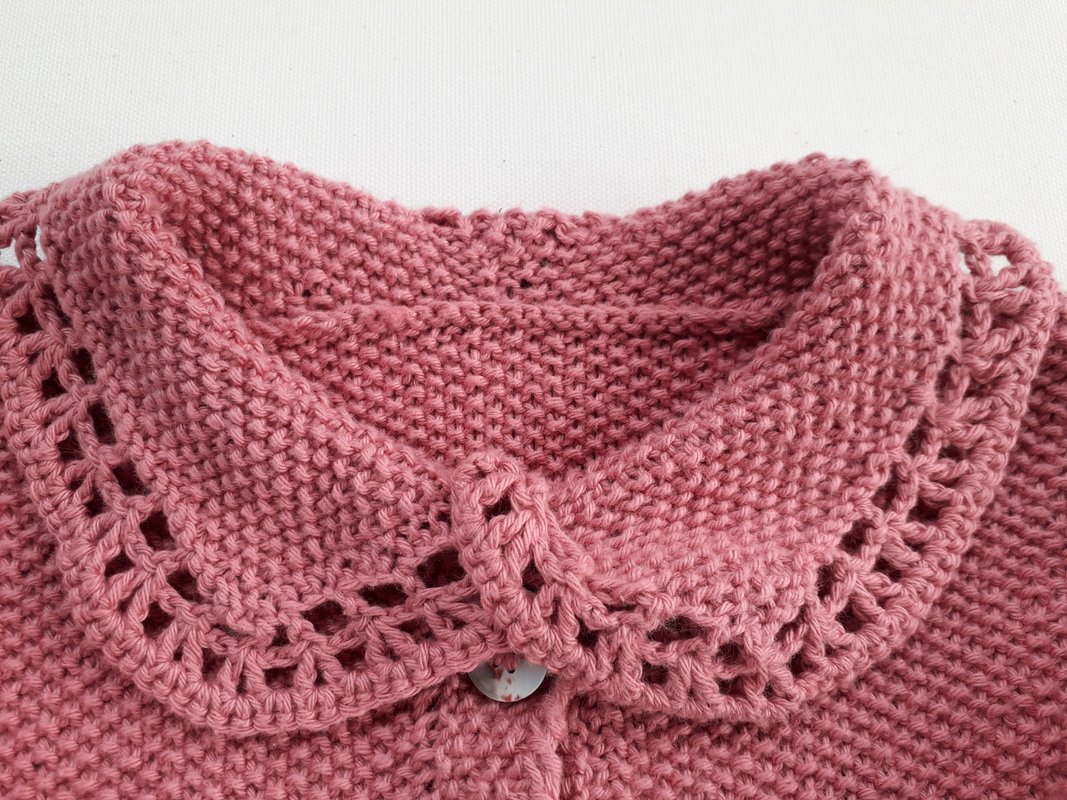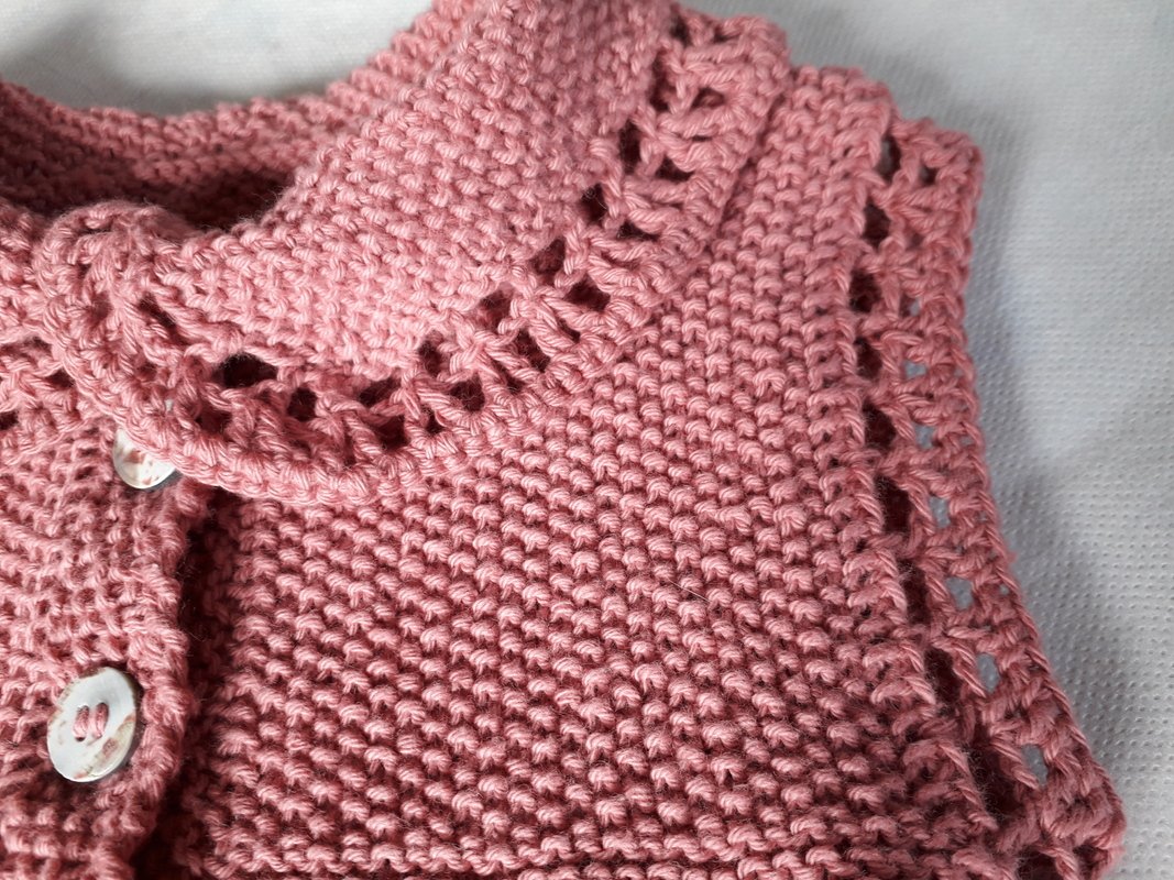Die Jacke ist in einem wunderschönen Strukturmuster gestrickt hat viele nette Details wie eine hübsche Kragenlösung und eine Häkelborte um den Kragen und an den Ärmeln.