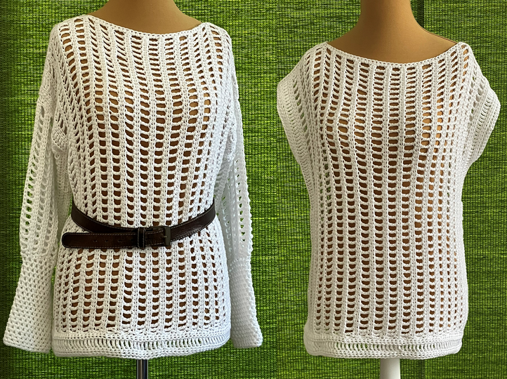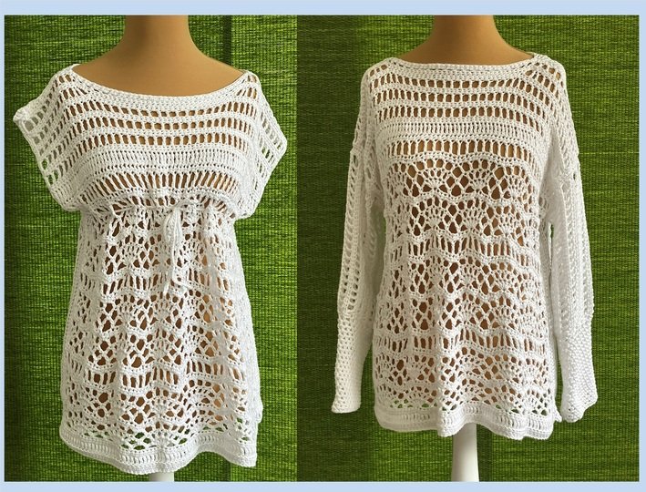 Du bekommst hier die Anleitung (in einem PDF) für zwei Pullis. Du suchst dir den aus, der dir besser gefällt: der einfache Pulli mit dem Lochmuster oder der etwas aufwändigere mit dem Fächermuster. Auch kannst du entscheiden, ob du den Pulli mit oder ohne Arme häkeln willst. Du kannst den Pulli als Langpullover oder Tunika, als Kurzshirt oder Oversize arbeiten, alles sieht einfach gut aus, egal welche Figur zu hast.
