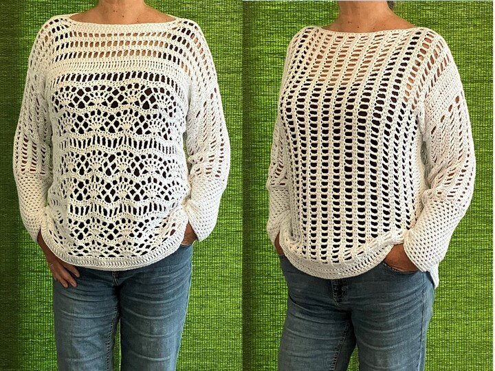 Du bekommst eine Anleitung im PDF-Format, in der beide Pullover ausführlich erklärt werden mit vielen Fotos und Häkelschriften. Die Pullover können in allen Breiten und Längen gehäkelt werden, mit oder ohne Arme. Die Anleitung deckt die Größen von S bis XXXXL ab. Ich zeige, wie das mit Sicherheit gelingt und dir passen wird.