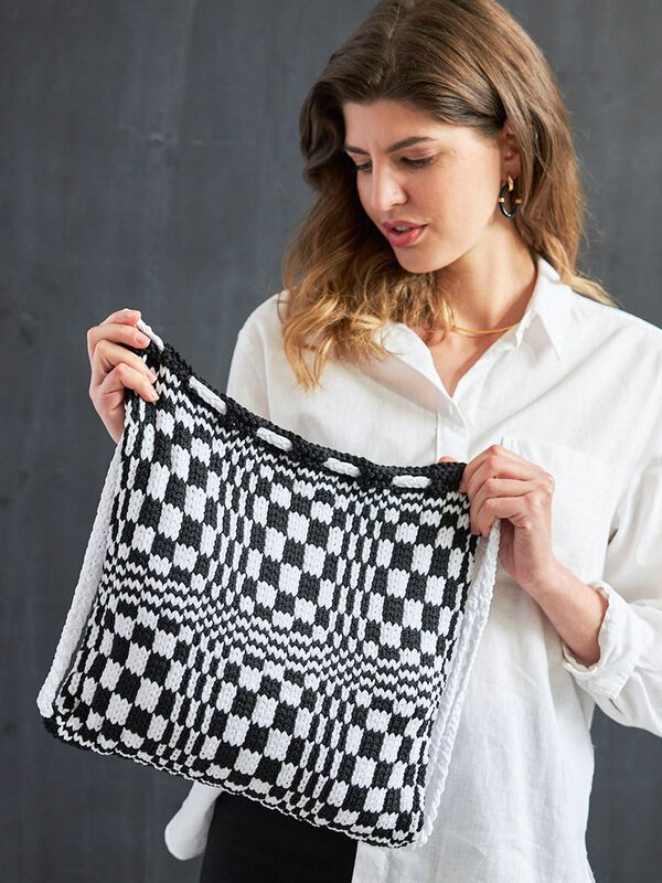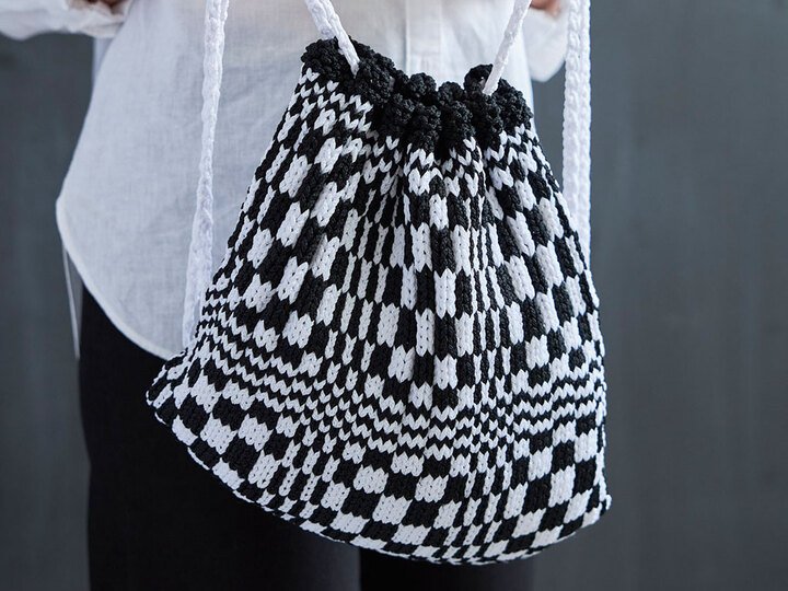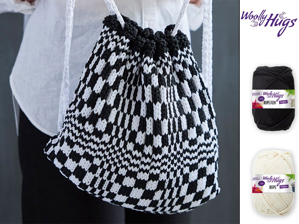 Mit meiner Anleitung für den gestrickten Rucksack-Beutel kannst du eine faszinierende Illusionen erschaffen. Das Stricken dieses Jacquardmuster erzeugt ein Muster, dass wie eine optische Täuschungen wirkt. Dieser Rucksack-Beutel wird definitiv alle Blicke auf sich ziehen!