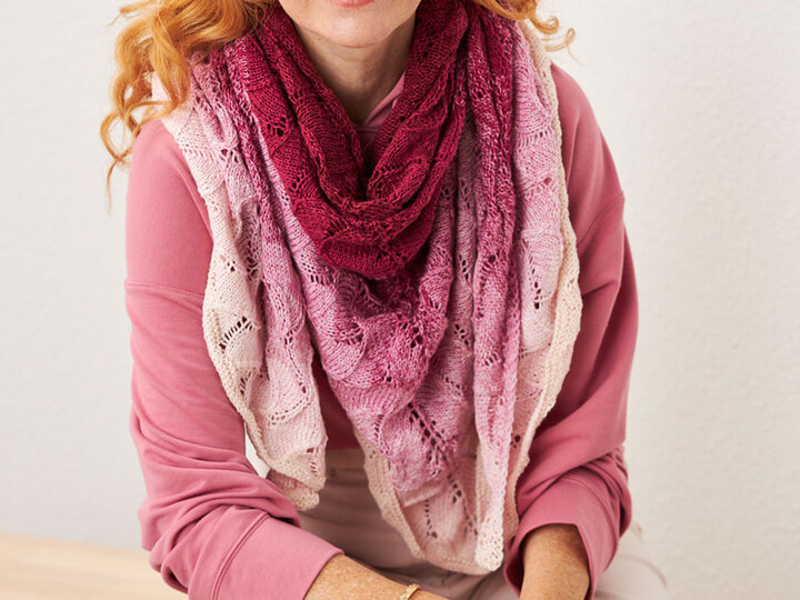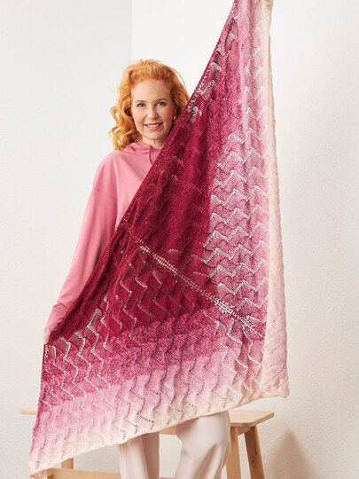 Mit eionem Wolly Hugs XXL Bobbel und dieser Anleitung kannst du ein wunderschönes Tuch mit einem sanften Farbverlauf von Rot nach Weiß kreieren. Das besondere Highlight ist das tolle Muster, das ab der Halsmitte entsteht und dem Tuch einen ganz individuellen Look verleiht.