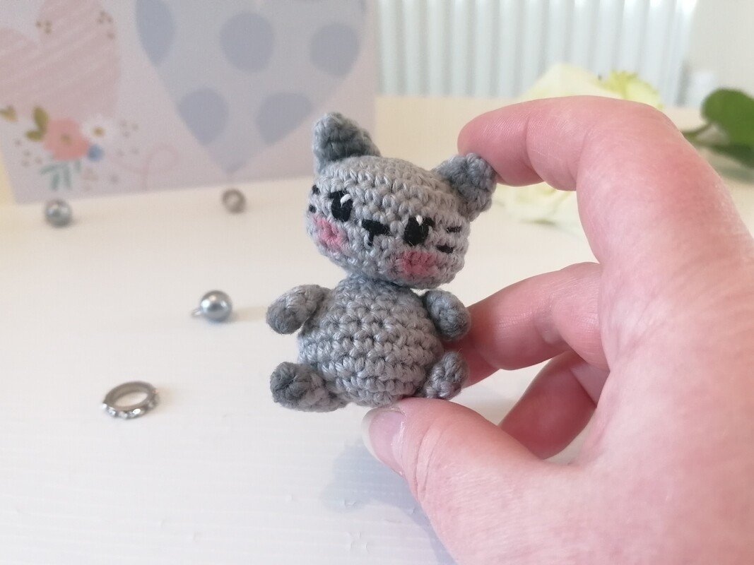 Mit dem angegebenen Garn und der Häkelnadel wird die Katze ca. 5,5 cm hoch.