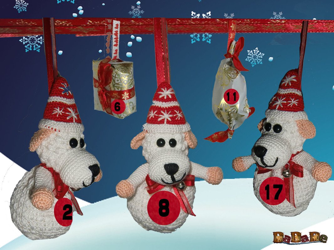 Das Schaf, sowie seine Adventskalender-Freunde, Bär, Maus, Pinguin und Rentier,