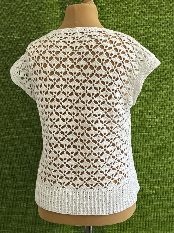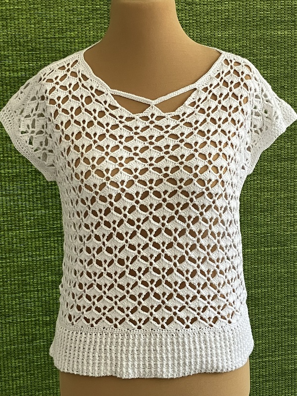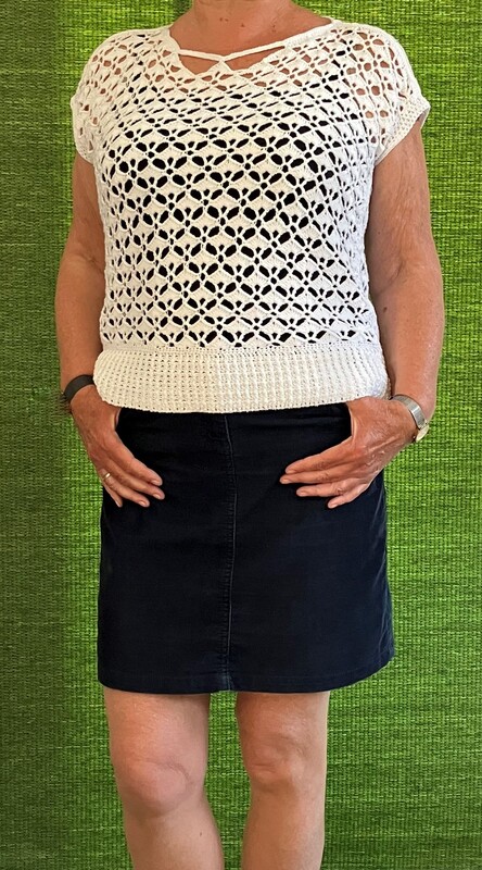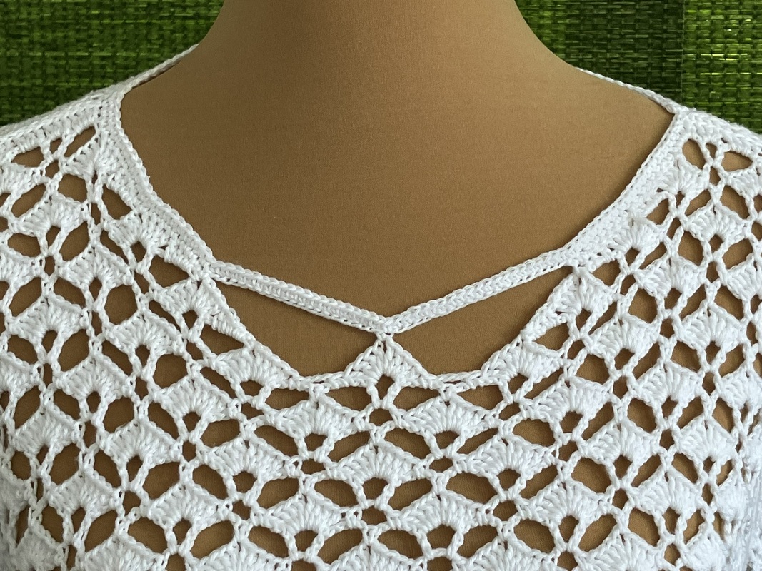 Dieses Shirt ist aus dünner geschmeidiger Baumwolle gehäkelt. Das Muster gefiel mir einfach zu gut, da musste ich gleich was draus machen. Du siehst hier das Ergebnis, ich hoffe, es gefällt dir. Das Shirt ist in zwei Teilen gehäkelt, Vorderseite und Rückenseite. Auf den aparten Halsausschnitt habe ich besondere Sorgfalt gelegt.