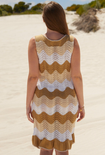 Das ärmellose Sommerkleid mit Pfauenmuster beeindruckt mit seinen Details. Der schwingende Volant-Saum in glatt rechts sorgt für Dynamik; beim einfach zu strickenden Pfauenmuster wechseln sich die Farbstreifen von Weiß über Beige bis Camel ab. Hals- und Armausschnitte und auch der Volantrand werden im genau erklärten Kordelmuster in Camel und Weiß umhäkelt. Ein Modell, das durch seinen runden Halsausschnitt und die passgenauen Armausschnitte eine schöne Schulterpartie erzeugt. Sehr angenehm an heißen Tagen ist das Garn aus reiner Baumwolle. Eine Anleitung steht für die Größen 38/40, 44/46 und 50/52 zur Verfügung.