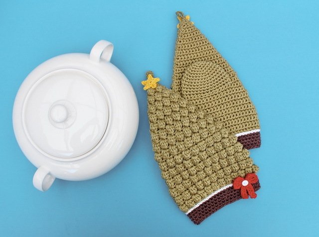 In dieser Anleitung wird beschrieben, wie man einen Satz Weihnachtsbaum-Ofenhandschuhe häkelt, wie auf den Bildern gezeigt, und zwar aus doppeltem Fäden Baumwollgarn (5-fdg Sockenwollstärke) und mit Häkelnadel Größe 4 mm.