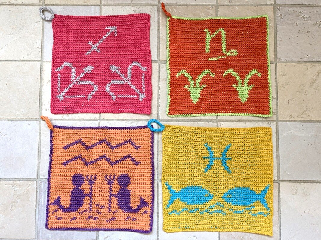 Hier bekommst Du alle 12 Sternzeichen-Motive als günstiges Spar-Set. Mit diesen Sternzeichentüchern hast Du immer ein passendes persönliches Geschenk für liebe Menschen parat – die Tücher können im Bad zum Abschminken oder Gesicht Waschen dienen, in der Küche sind sie je nach Stärke des verwendeten Baumwollgarns dekorative Spültücher oder Topflappen. Sie sind recht schnell und einfach zu häkeln, machen richtig Spaß und sind garantiert etwas Besonderes!