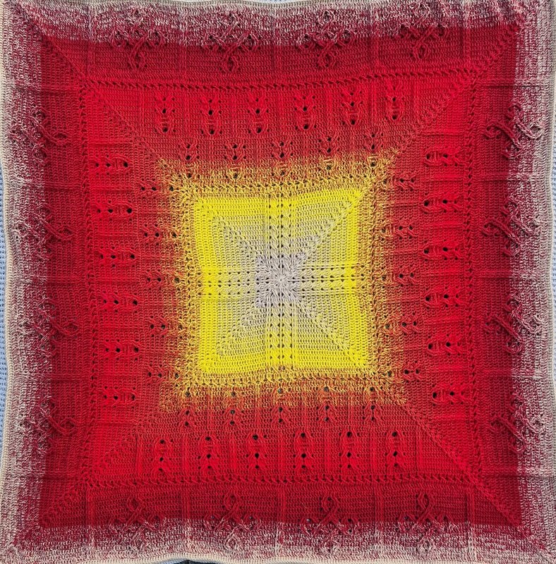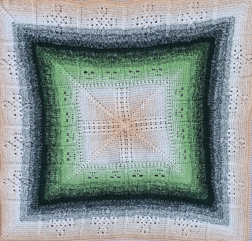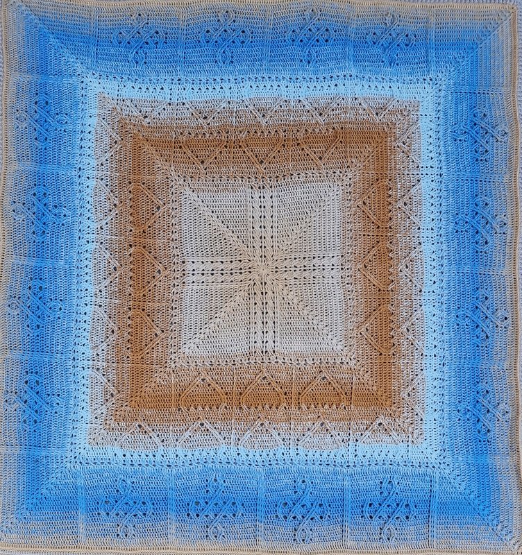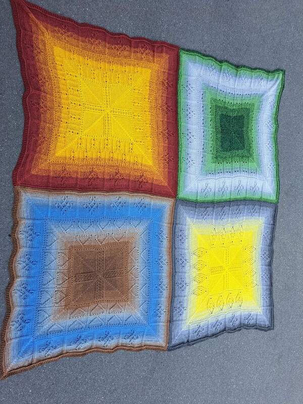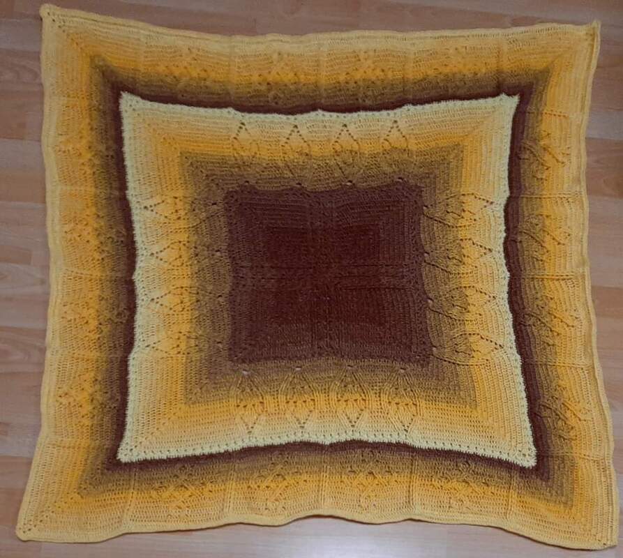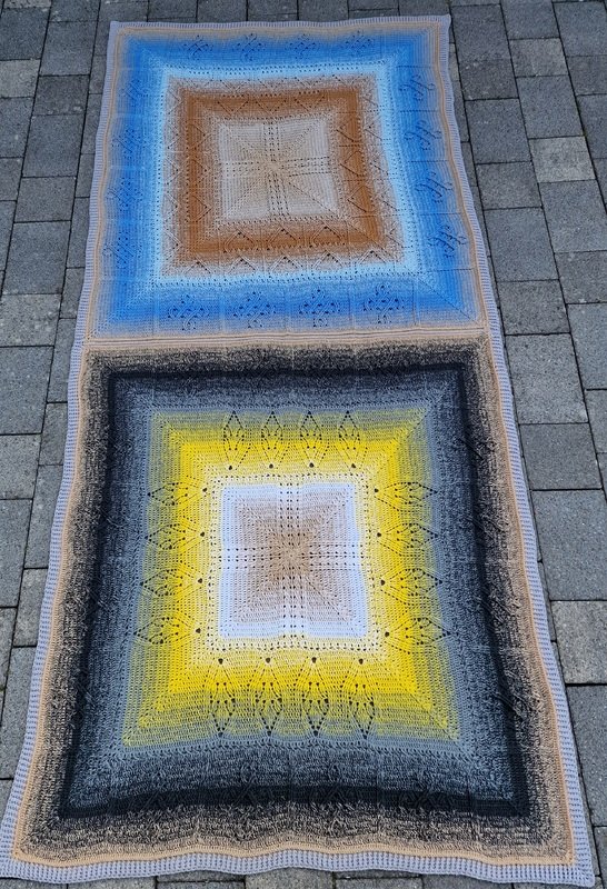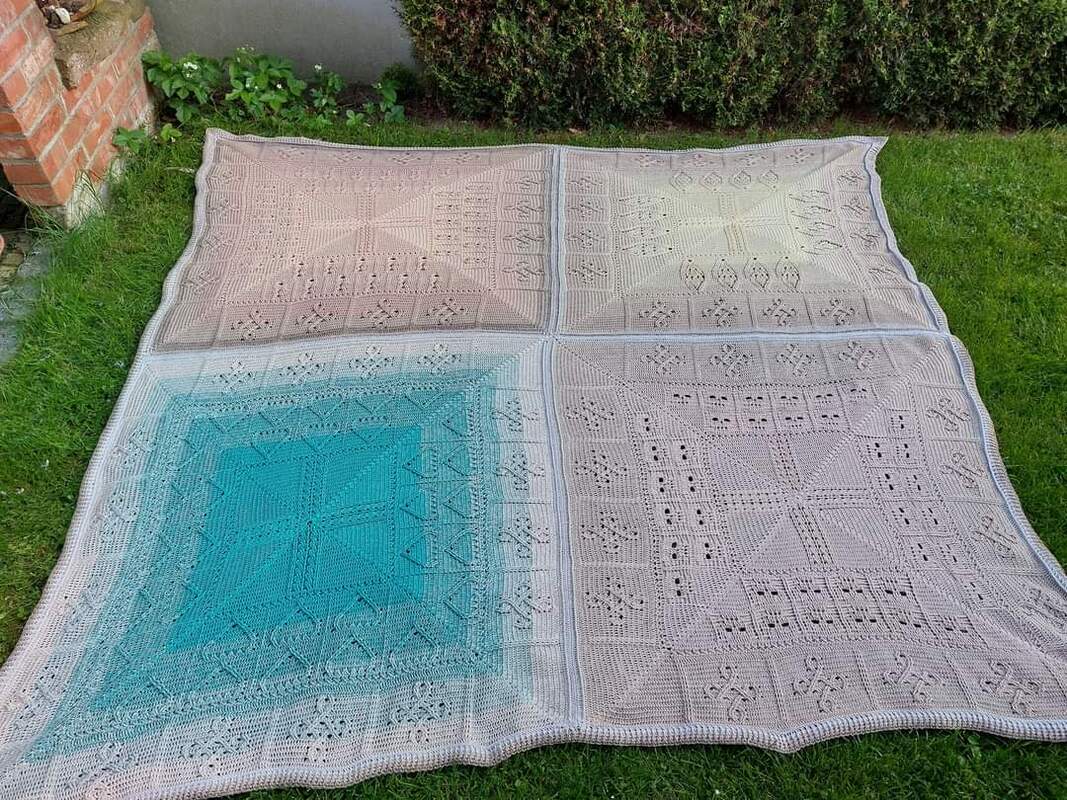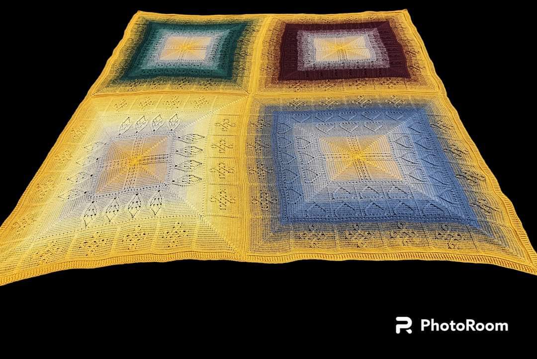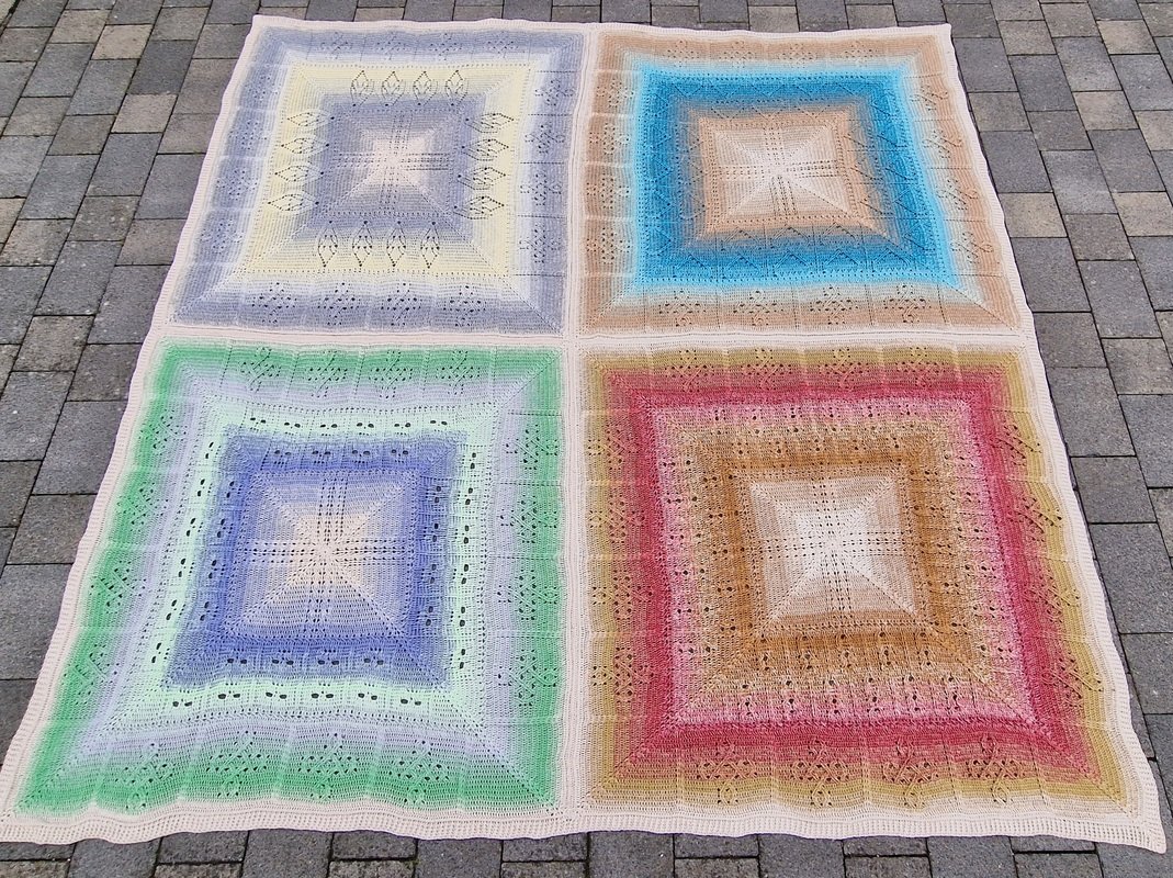 Als große Tagesdecke (alle 4 Quadrate aneinander) häkeln könnt.