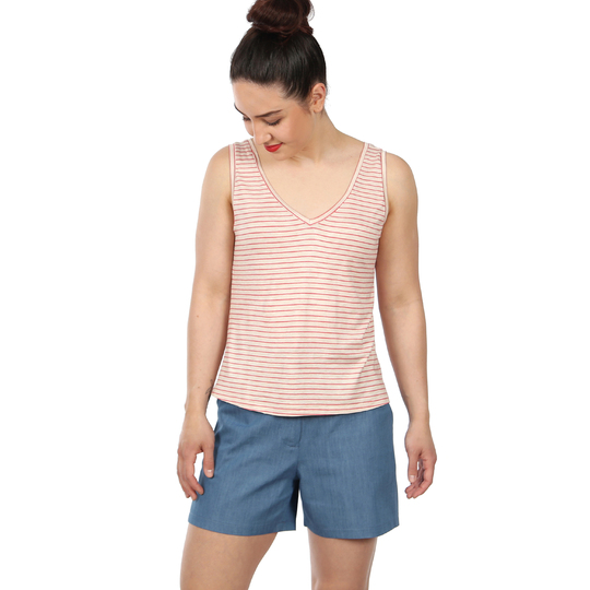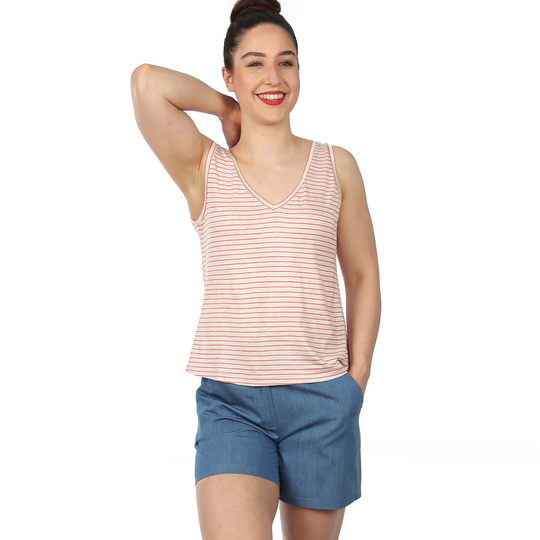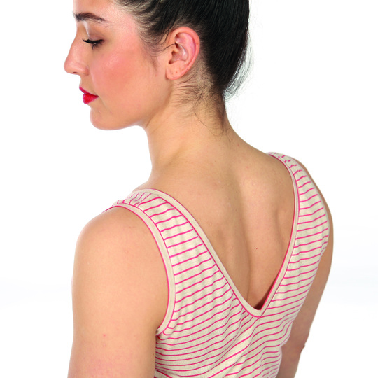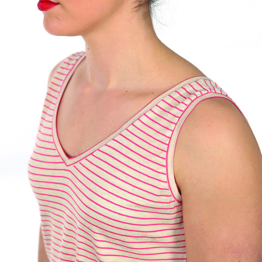 Mit FRAU JILL kannst Du den Sommer in vollen Zügen genießen, denn dieses schöne Jersey-Top ist schnell genäht und ergänzt Deine Garderobe um ein sportlich-feminines Teil. V-Ausschnitte in Vorder- und Rückenteil sind der Eyecatcher an FRAU JILL, sie werden mit schmalen Bündchen eingefasst. Die Trägerbreite ist so gewählt, dass kein BH-Träger herausblitzt. Je nach Auswahl von Stoff, Muster oder Farbe kann FRAU JILL sportlich oder festlich wirken.
