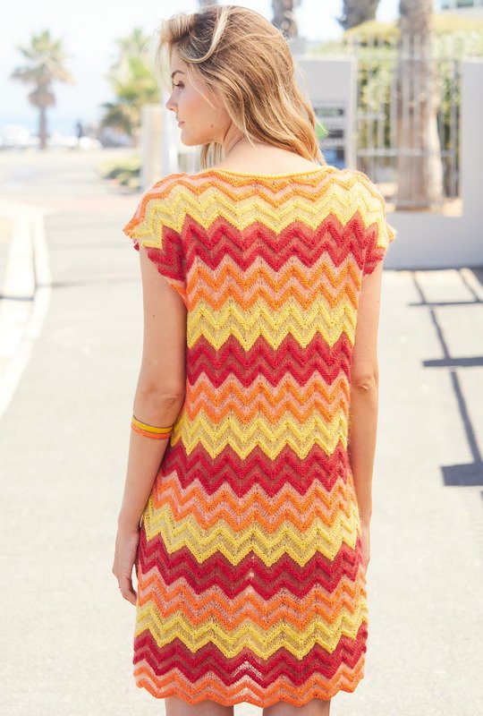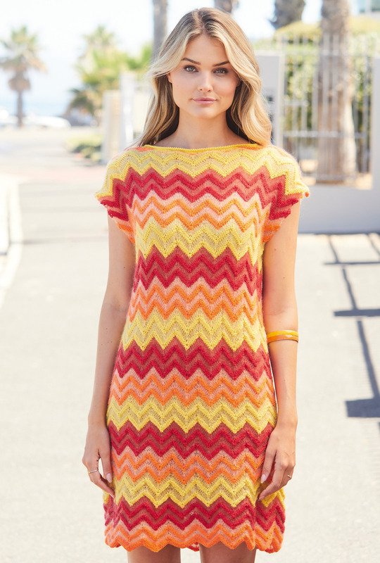 Dieses ärmellose Minikleid im Zackenmuster beeindruckt durch seine unterschiedlichen Texturen und das kraftvolle Farbspiel – hier kommen zwei Qualitäten und insgesamt sechs verschiedene Farben zum Einsatz. Die glatt links gestrickten Zacken aus rotem, orangenem und gelbem Baumwollgarn heben sich hervor und nach jeder dieser Farben folgen glatt rechts gearbeitete Streifen aus zartem Mohair-Seide-Garn – so entsteht die lebhafte Dynamik dieses Sommerkleid. Dafür braucht es keinen aufwendigen Schnitt; ganz gerade Teile mit lediglich einem kleinen runden Halsausschnitt reichen völlig aus. Die Anleitung kann in den Größen 38/40, 42/44 und 46/48 downgeloadet werden.