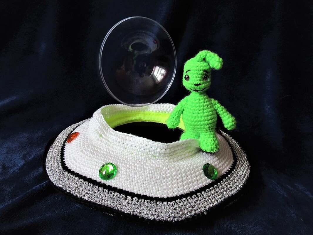 Das UFO wird aus phosphoriszierendem Garn gehäkelt, so dass es im Dunkeln leuchtet. Die Glaskuppel lässt sich öffnen, so dass der Alien aussteigen kann.