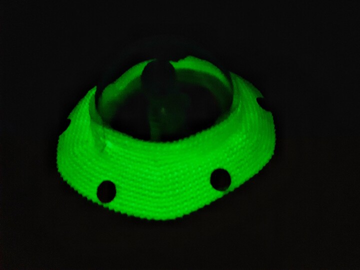 Das UFO wird mit phosphoriszierendem Garn gehäkelt. Dieses Garn ist weiß, leuchtet aber im Dunkeln mit der typischen phosphorgrünen Farbe. Damit es im Dunkeln schön leuchtet, muss man es vorher mindestens 15 Minuten in die Sonne legen oder mit einer hellen Lampe bestrahlen.