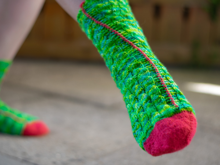 Die Socken werden hauptsächlich in Reihen gestrickt, außer an der Ferse und der Spitze. Sie werden zum Schluss mit einer Ziernaht geschlossen.
