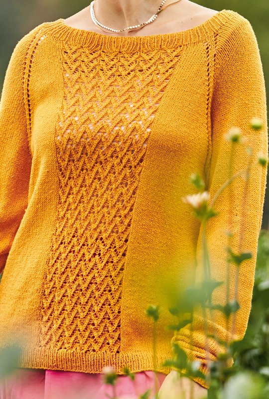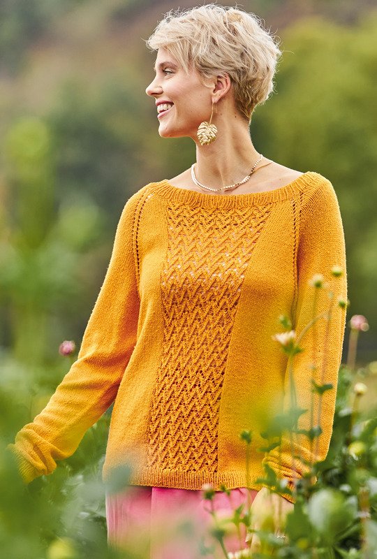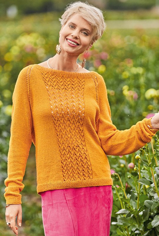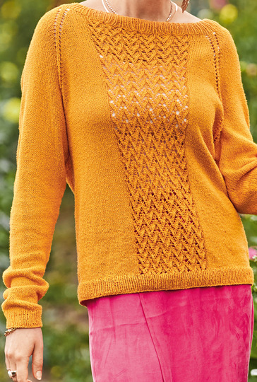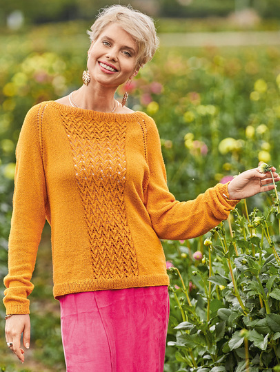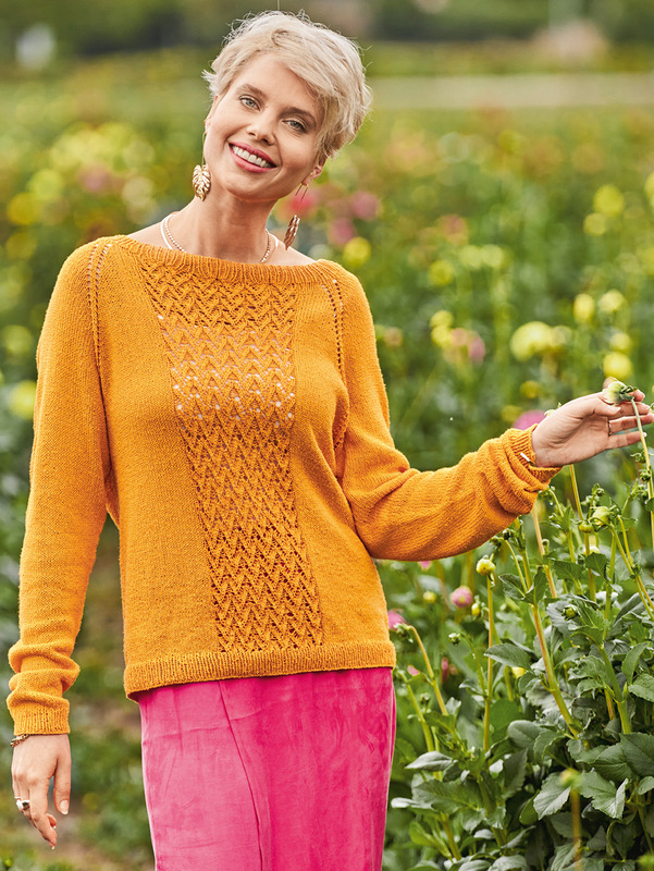 Dieser dekorative sonnenfarbene Strickpulli für laue Sommerabende wird "Raglan von oben", also an einem Stück von Halsausschnitt abwärts gestrickt: Somit entfällt das lästige Zusammennähen der Einzelteile am Ende der Strickarbeit. Gestrickt wird mit einem Garn aus 100 % Seide glatt rechts, im Rippenmuster und, für den dekorativen Streifen in der Mitte von Vorder- und Rückteil, im Ajourmuster. Die ausführliche Strickanleitung für die Größen 36/38, 40/42 und 44/46 inklusive Schnittzeichnung und Strickschrift erleichtert das Nachstricken auch für etwas ungeübtere Strickerinnen.
