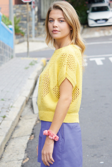 Der kurze, ärmellose Pulli mit stark überschnittenen Schultern beeindruckt durch seinen strahlend gelben Farbton. Unterstrichen wird der modische Look durch das Lochmuster, das in markanten großen Rauten angeordnet ist. Am Saum liegt der Pulli noch schmal am Körper an, nach oben werden Maschen zugenommen, so dass er im Brustbereich ganz locker den Körper umspielt. Das Baumwoll-Mischgarn hat einen supersoften Griff und fühlt sich wunderbar auf der Haut an. Die Anleitung dazu gibt es für die Größen 36/38 und 40/42 sowie 44/46.