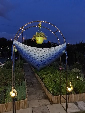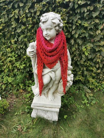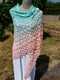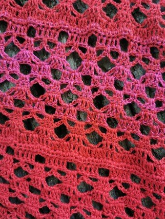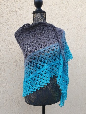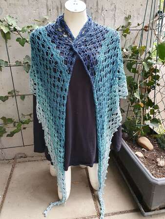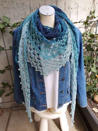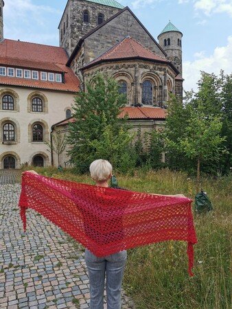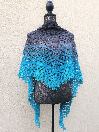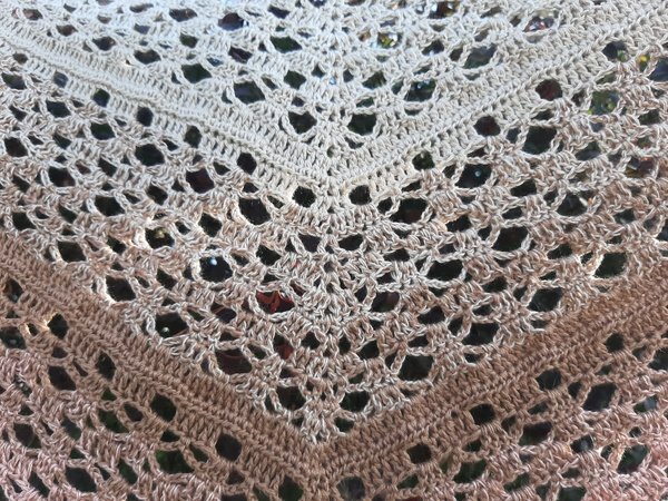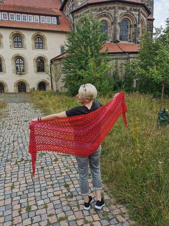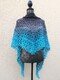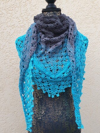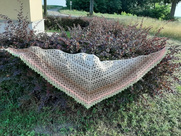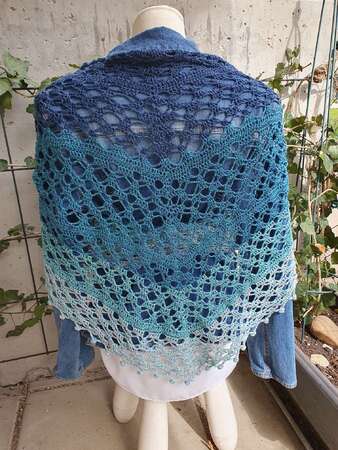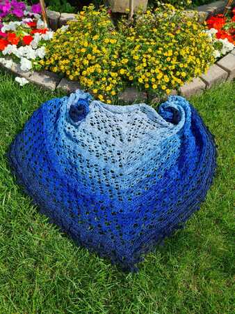 Das Tuch kann in beliebiger Größe gearbeitet werden. Das Tuch auf dem Titelbild wurde mit 860 m 3-fädigem Farbverlaufsgarn locker mit Nadelstärke 3,5 gehäkelt und hat eine Größe von 208 x 63 cm.