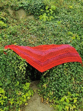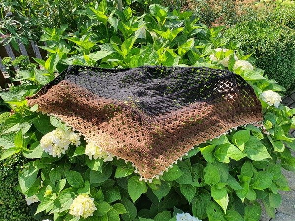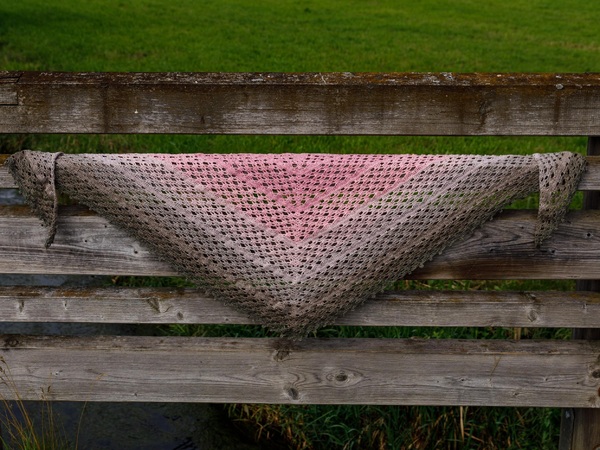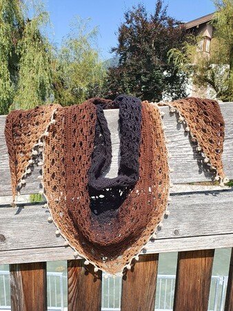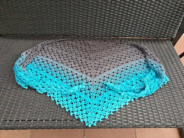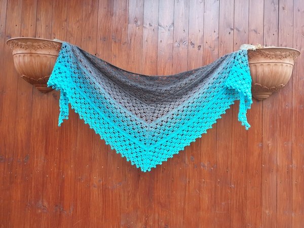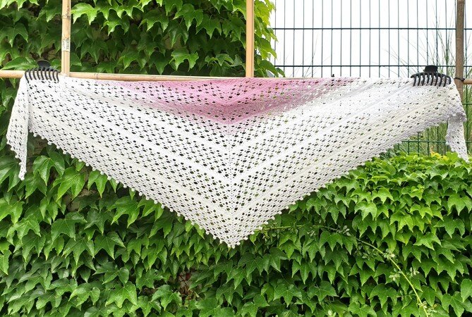 Du kannst das Tuch mit beliebigem Garn häkeln. Die benötigte Garnmenge ist abhängig von der Wunschgröße, dem gewählten Material und deinem persönlichen Häkelstil. Bei Farbverlaufsgarn empfehle ich je nach gewünschter Tuchgröße eine Lauflänge zwischen 900 und 1200 m 3-fädig.