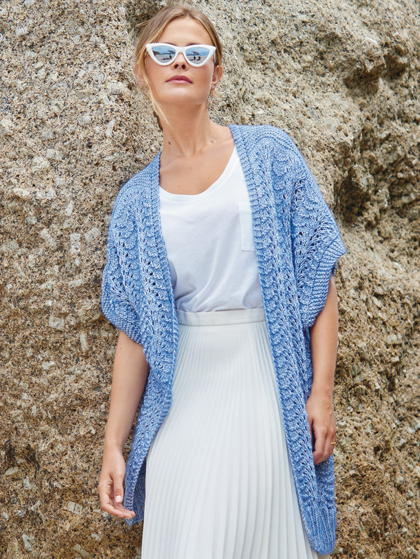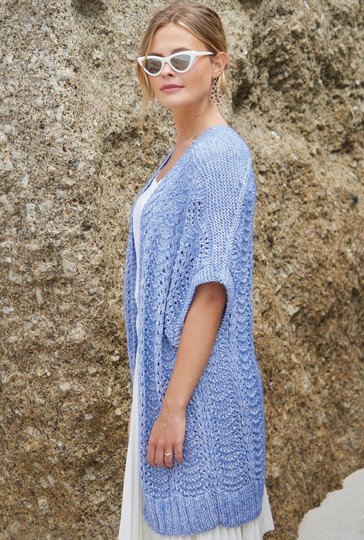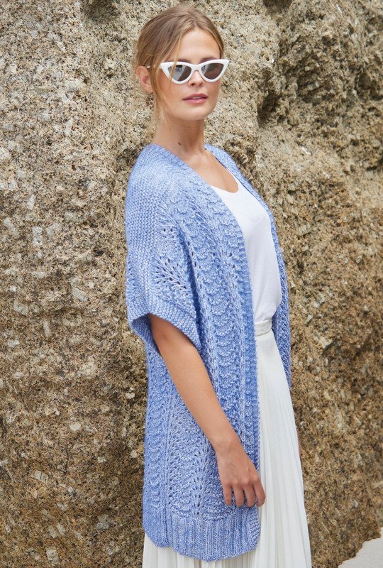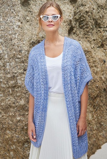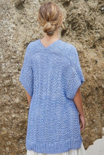 Als modisches Accessoire erfüllt diese lange blau melierte Weste aus Baumwoll-Mischgarn auch eine wärmende Mission, wenn es zwar schon warm, aber doch noch ein bisschen zu kühl nur mit T-Shirt ist. Das Pfauenmuster ist einfach zu stricken und auch die Passe in kraus rechts. Darum können sich auch StrickerInnen mit noch wenig Erfahrung daran wagen. Die Blenden werden gleich mitgestrickt, so dass nach getaner Arbeit nur noch zusammengenäht werden muss. Eine Anleitung steht für die Größen 36 – 40 und 42 – 46 zur Verfügung.