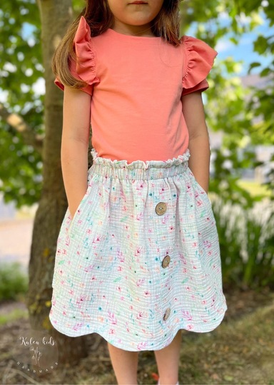 Du kannst den Rock in der normalen Variante oder mit Fake-Knopfleiste nähen. Der Bauchbund wird mit einfachem Gummieinzug, mit doppeltem Gummieinzug oder mit Paperbag Bund genäht. So lässt sich der Rock super easy anziehen und trägt sich besonders bequem.
