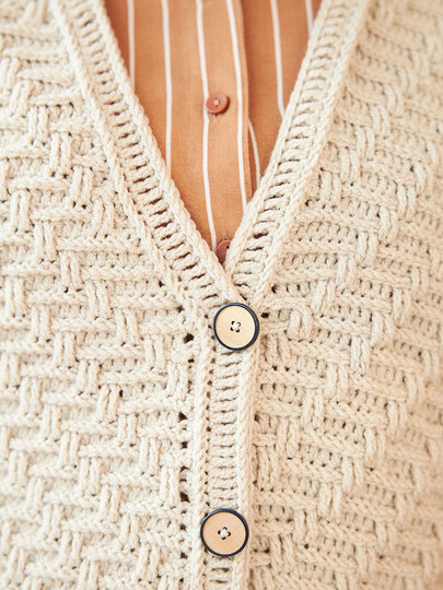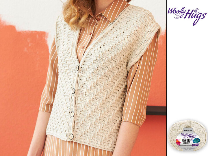 Diese Weste wird aus einem hochwertigen Garn mit Seidenanteil und Stretch-Eigenschaften gefertigt, was für einen luxuriösen Tragekomfort sorgt. Das schöne Muster der Weste verleiht ihr eine einzigartige Note, während die angenehme Haptik dich begeistern wird.