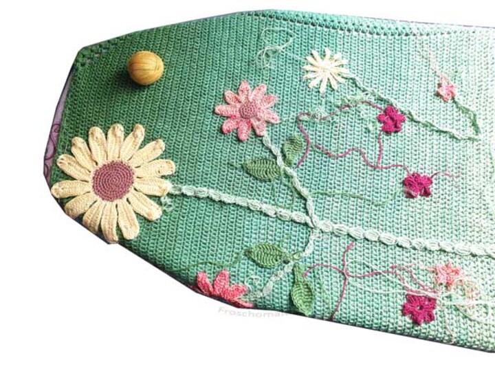 Hier tummeln sich viele Häkelblumen, Blüten, Blätter, ein Marienkäfer und ein Schmetterling als Deko.
