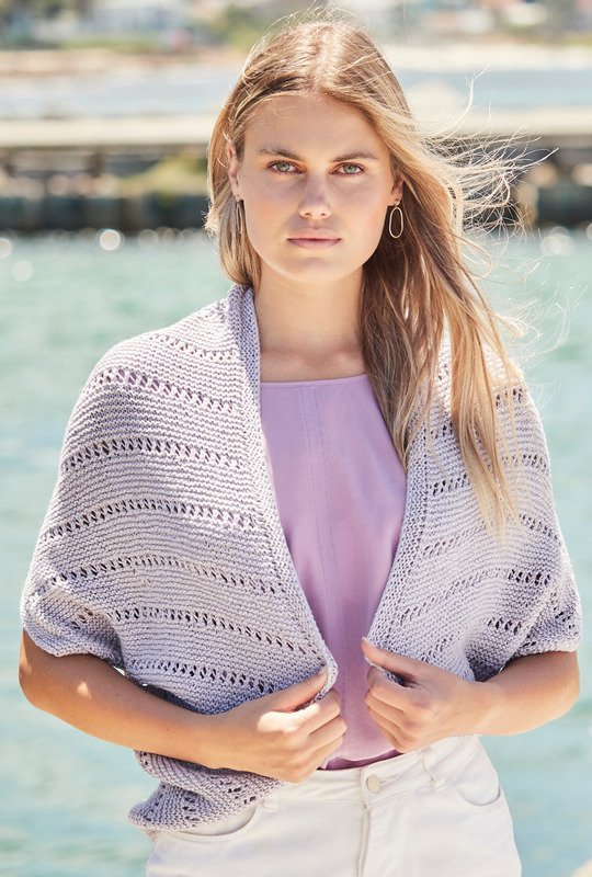 So außergewöhnlich wie diese fliederfarbene Jacke aussieht, so einfach ist sie zu stricken. Man arbeitet ganz einfach ein großes Rechteck, schlägt die Ecken ein und näht sie an die gerade Kante; in der Anleitung ist dafür ein Schema vorhanden. Dieser Ärmelponcho schmiegt sich jedem Figurtyp an und beeindruckt zudem durch sein harmonisches Zusammenspiel aus Kraus-rechts- und Lochmusterreihen. Der matte Glanz kommt vom Leinen- und Viskoseanteil des Mischgarns. Die Anleitung dazu gibt es für die Größen 36 – 40 und 42 – 46.
