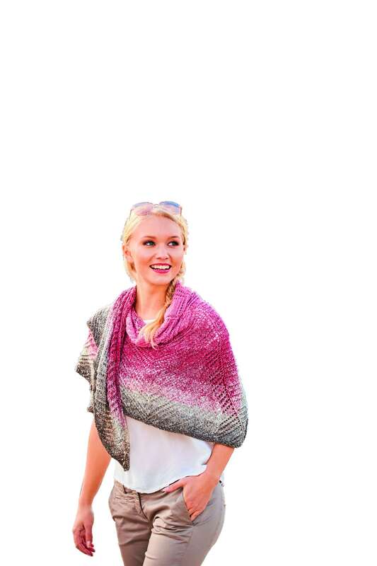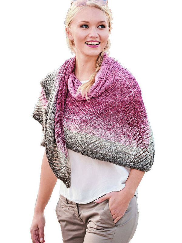 Ein Tuch für ein Titelbild, so traumhaft schön! Es wird komplett mit einem schönen kleinen Lochmuster gestrickt. Die sanften Farben verlaufen von Rosa zu einem schönen Beerenrot und enden in einem Hell- bis Dunkelgrau. Eine tolle Farbkombination die zu vielen Outfits passt. Zusätzlich zu dem Bobbel verarbeiten wir einen beilaufenden Glitzerfaden in Silber. Und keine Sorge, dieser Glitzerfaden ist sehr weich und kratzt garantiert nicht!