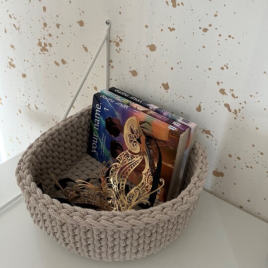 Es ist genau beschrieben, wie ein Korb in der Größe 26cm x 27cm x 10cm (B x T x H) zu häkeln ist. Allerdings erkläre ich in der Anleitung auch wie zwei kleinere Größen zu häkeln sind.