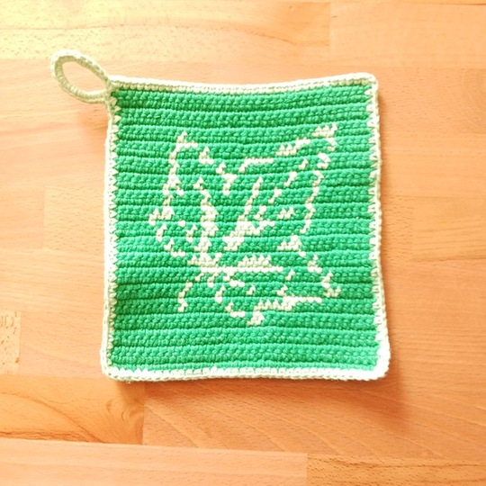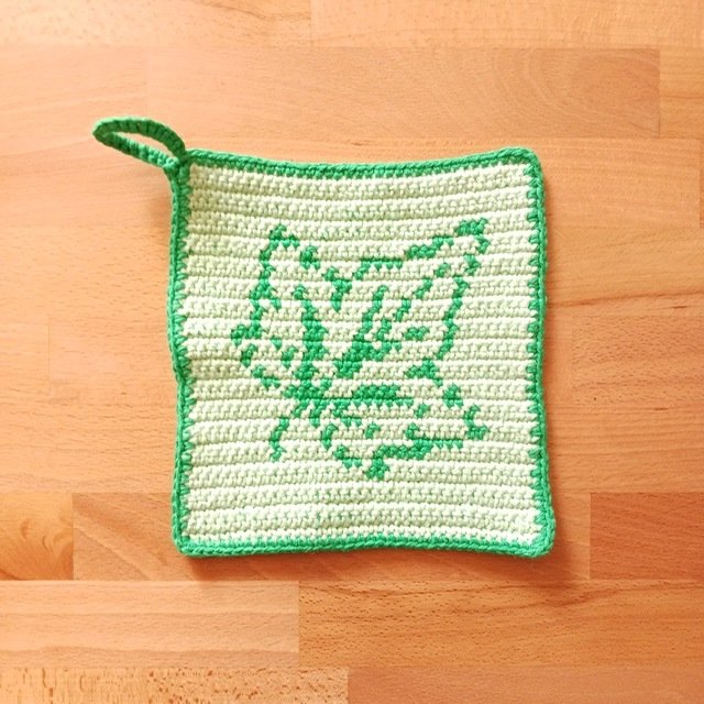 Mit der von mir verwendeten WOlle hat der Topflappen eine Größe von ca 20cm x 20cm.