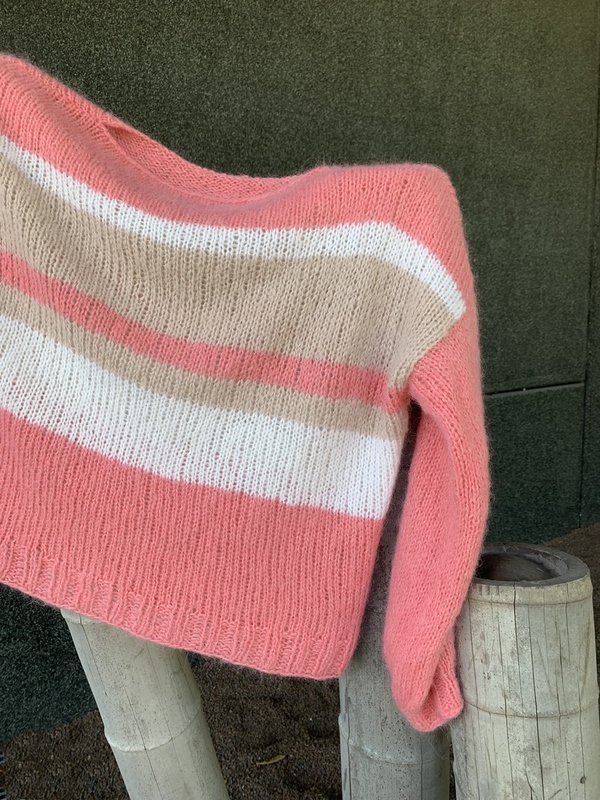 Jedes Teil wird separat gearbeitet und später angenäht bzw. zusammengenäht. Der Pullover hat überschnittene schräge Schulterpartien.