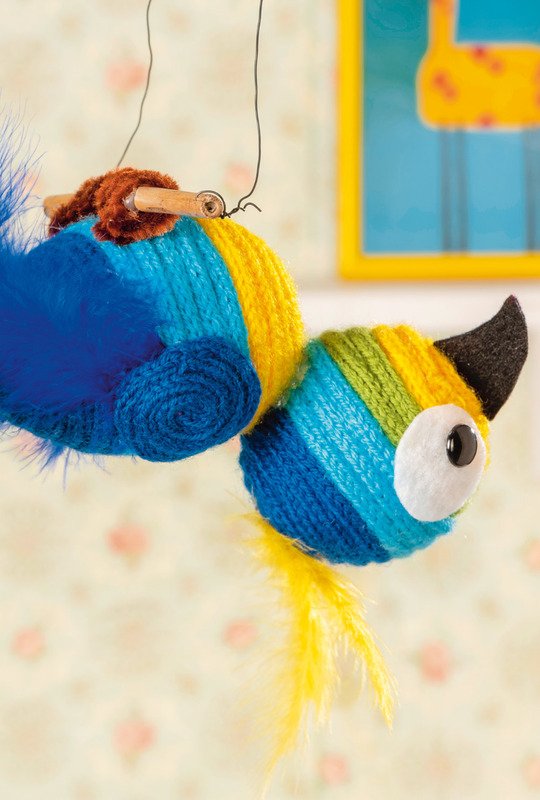 Den farbenfrohen Papagei können auch schon etwas größere Kinder selbst basteln. Zuerst heißt es bunte Wollkordeln mit der Strickliesel stricken. Diese werden dann um Styroporkörper geklebt und mit Federn geschmückt. Aus Filz ausgeschnittene Augen und Schnabel sowie Halbperlen-Tieraugen sorgen für ein ausdrucksstarkes Gesicht. Mit Hilfe von Blumendraht, einem kleinen Rundholz oder Ast und Chenilledrraht, der für die Füße um den Rundstab bzw. den Ast gebogen wird, bekommt der fröhliche Paradiesvogel eine Schaukel, mit der er eifrig durch Lüfte des Kinderzimmers schwingen kann. Mit solchen Strickschnüren haben viele Handarbeitsexperten von heute begonnen. Vielleicht wirst auch du durch den strahlenden gebastelten Papagei später mal zum Handarbeitsprofi.