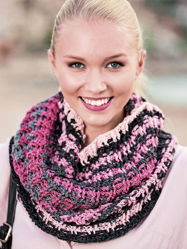 Ein kleiner Loop, gehäkelt mit Reliefmaschen, die ein tolles rustikales Maschenbild ergeben. Besonders reizvoll sind die Streifen, denn diese entstehen durch den Woolly Hugs Bobbel BUTTERFLY wie von Zauberhand ganz von selbst. Durch die Reiefmaschen wirken die Streifen wie verwaschen, also ohne klare Trennlinie, wodurch der Schal besonders hübsch und interessant aussieht.