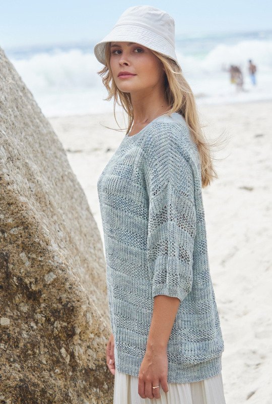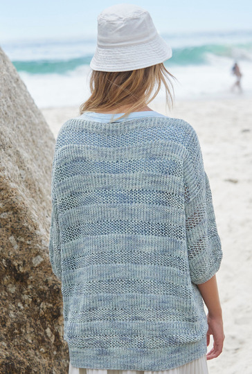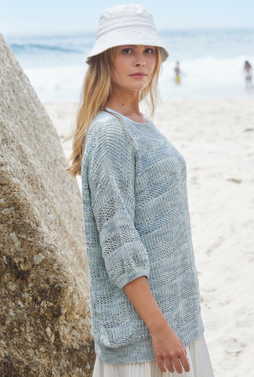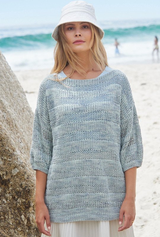 Ganz gerade geschnittene Teile ergeben einen Oversize-Pullover in Kastenform. Dreiviertelärmel und ein gerader, breiter U-Boot-Ausschnitt fallen ebenfalls ins Auge. Ein bequemer Allrounder also für jeden Tag. Streifen aus Halbpatentmuster, dessen glatte Seite zu sehen ist, und Streifen aus einem einfaches Lochmuster verleihen dem Pulli eine dezente Struktur. Das melierte Garn mit Seidenanteil in Mint-Jeans-Grau ist wunderbar anschmiegsam. Saum- und Ärmelbündchen werden als Rippen 1 rechts, 1 links gestrickt. Dafür gibt es eine Anleitung für die Größen 38/40, 42/44 und 46/48.