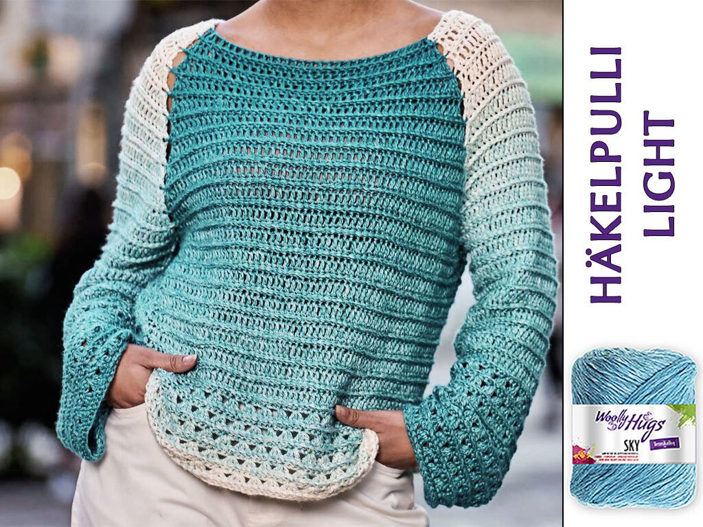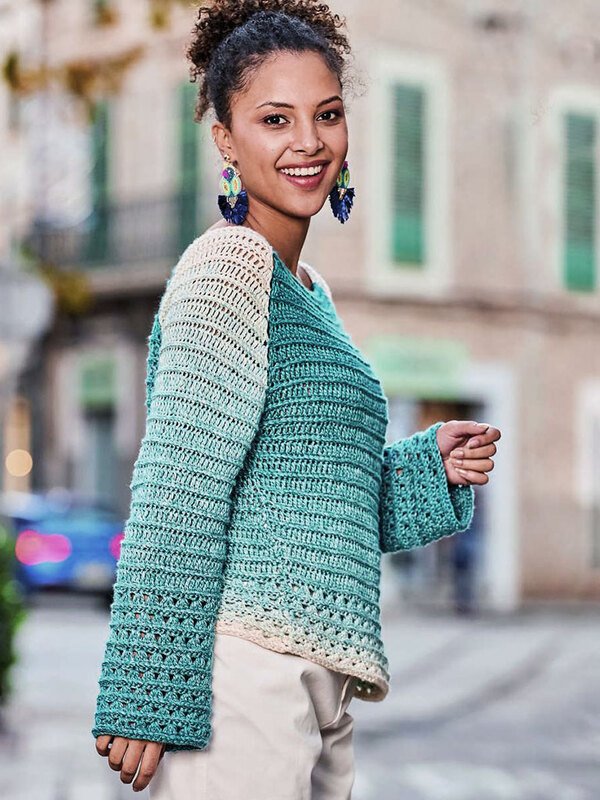 Die frischen Farben dieses Häkelpullis fallen sofort ins Auge. Der Farbverlauf aus Aquamarin und Türkis hin zu Cremeweiß erinnert an karibische Strände und Buchten. Das Besondere daran: Der Farbverlauf ist bei den Ärmeln andersherum gearbeitet wie an Vorder- und Rückteil - ein schönes Detail das die Schulternaht noch etwas mehr zur Geltung bringt. Die Ärmel sind außerdem extra lang gearbeitet und sorgen so für einen bequemen und lässigen Look.