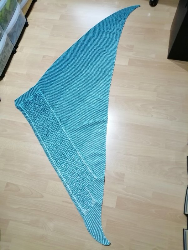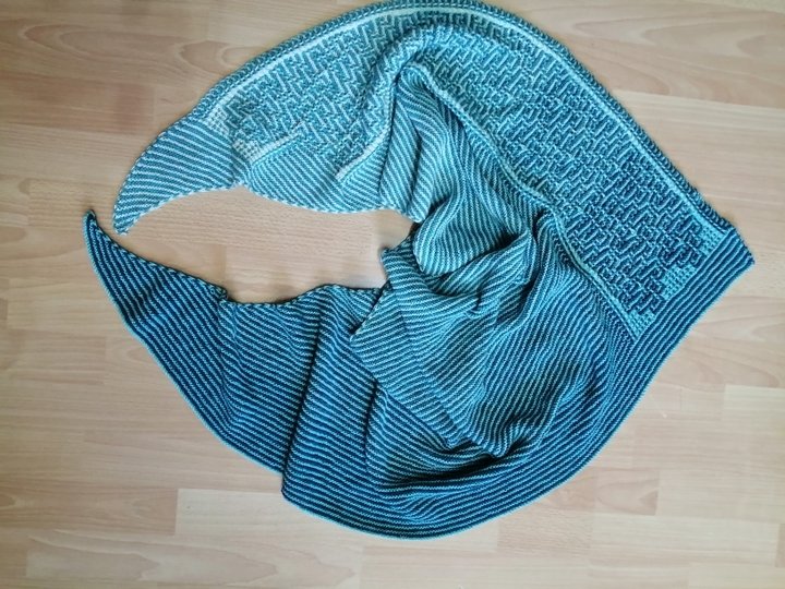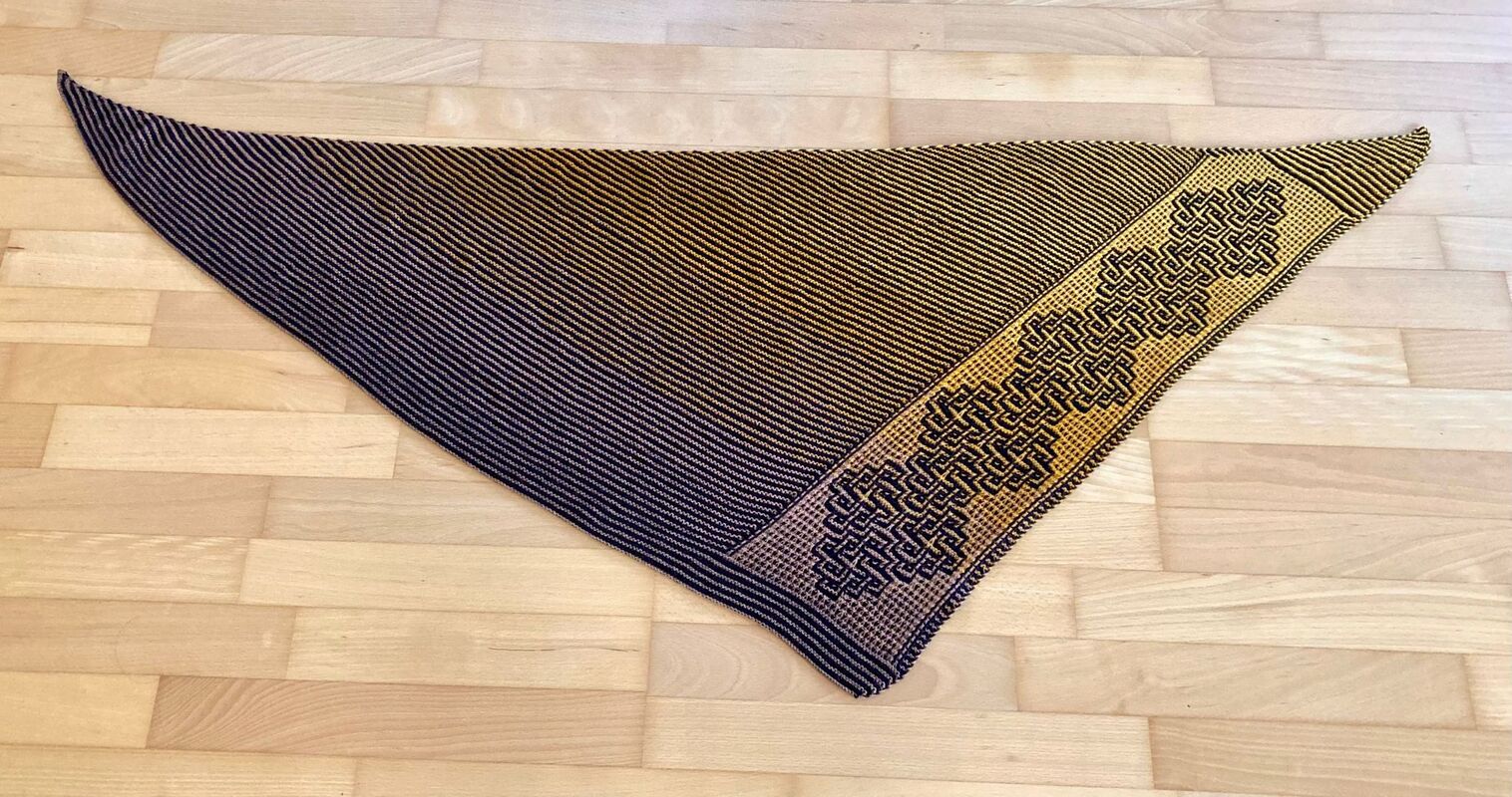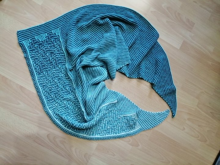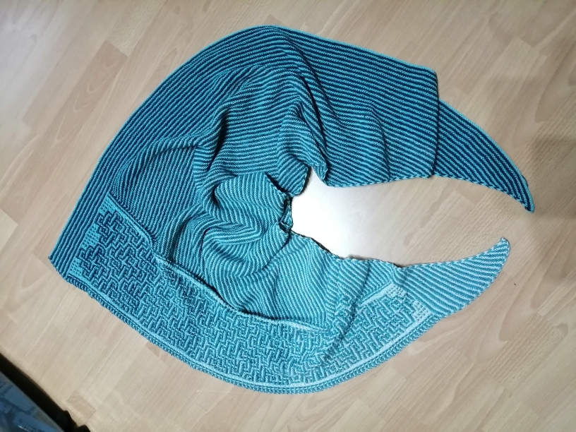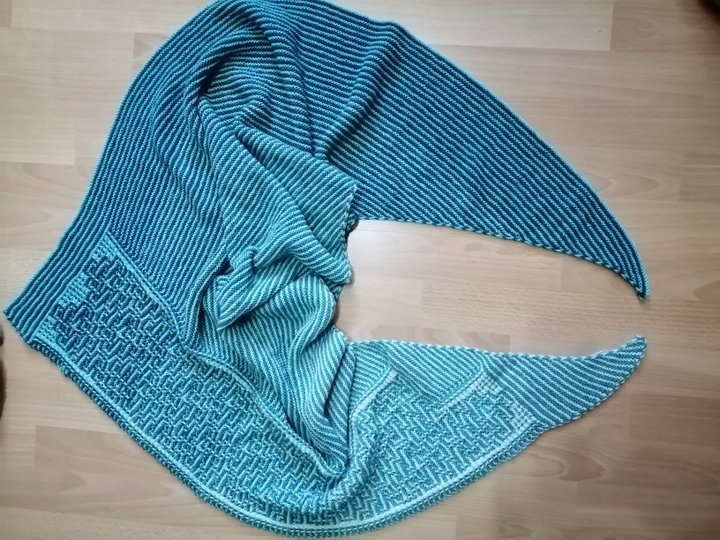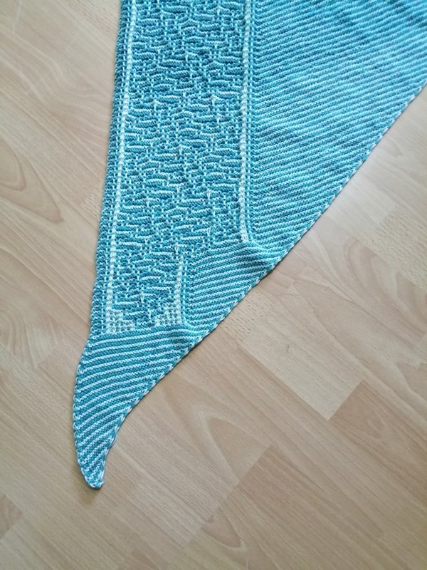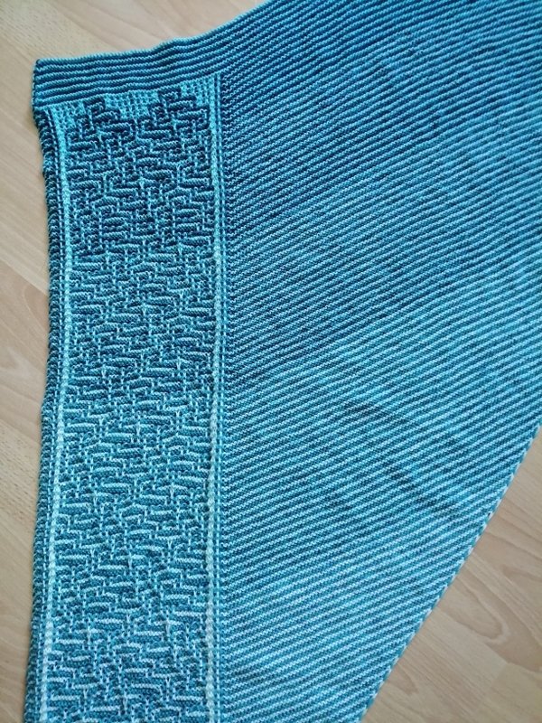 Dieses Tuch ist fast gleichschenkelig und auf einer Seite ist ein Hebemaschen Muster eingearbeitet.