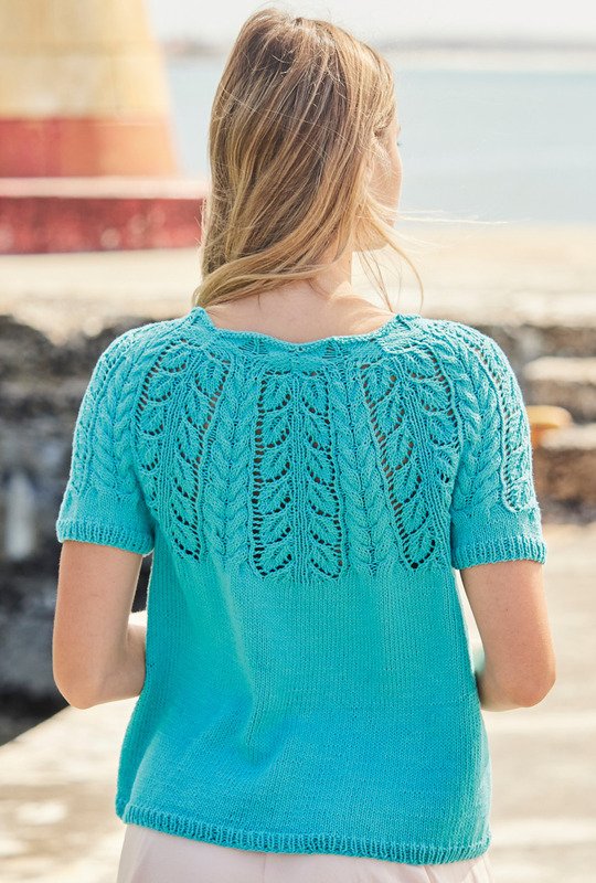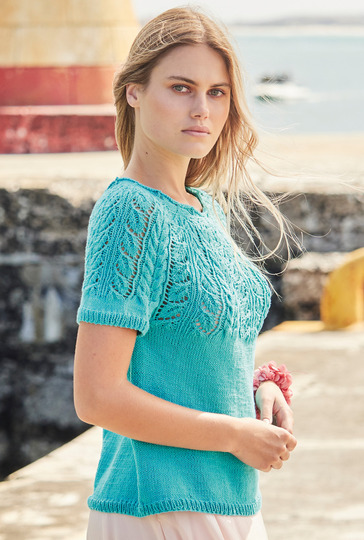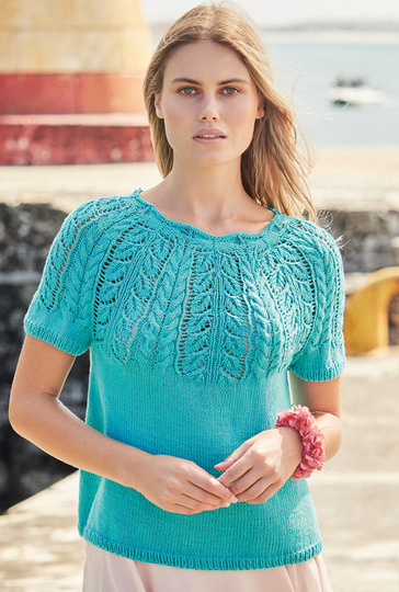 Der Kurzarmpulli in leuchtendem Petrol lebt von seiner markanten, prachtvollen Ajour-Zopfpasse, die in einem Zackenmuster endet. Bis zu den Armausschnitten werden Vorder- und Rückenteil in einem Stück rundgestrickt, die Ärmel gerade in Reihen, danach kommen alle Maschen auf eine Rundstricknadel und die Musterpasse beginnt. Ein Leckerbissen für alle versierten StrickerInnen, die abwechslungsreiches Stricken lieben. In einer großen Strickschrift sind die Abnahmen zur Formgebung gleich mit enthalten. Eine Anleitung für diesen Pulli aus reinem Baumwollgarn gibt es für die Größen 36/38 (40/42) 44/46.