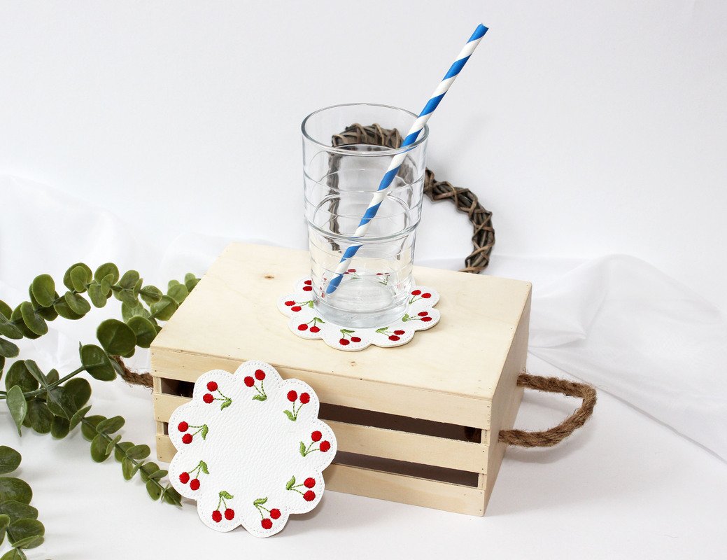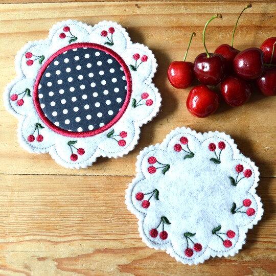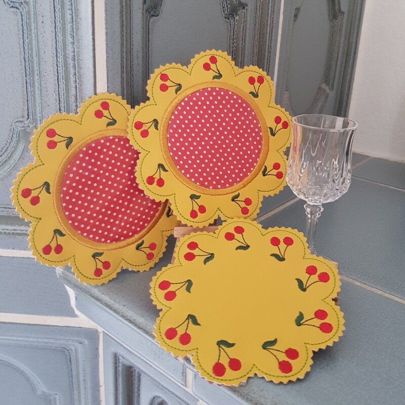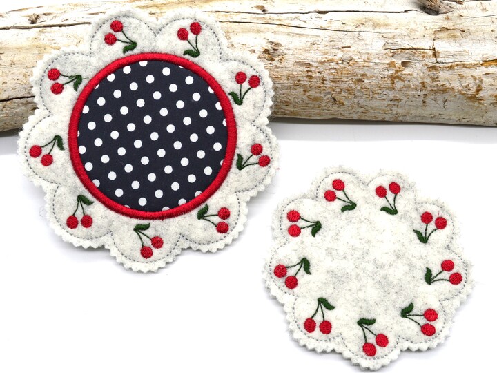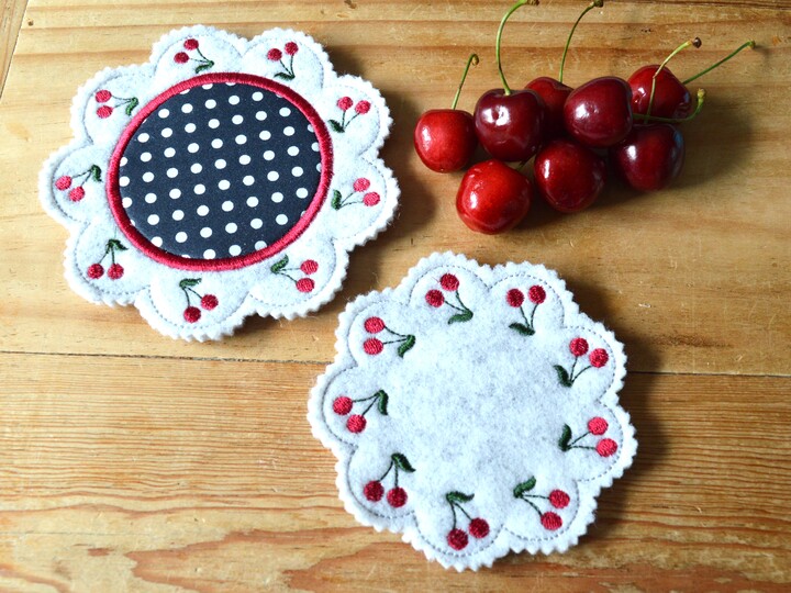 Stickdatei für blumige Untersetzer als ITH Stickdatei ohne Wendeöffnung. Sie werden mit kleinen Kirschen bestickt. Die Untersetzer werden nach dem Sticken außen herum ausgeschnitten.