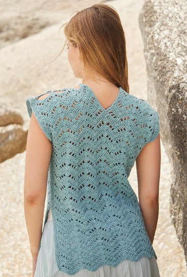 Das gehäkelte Top aus Baumwolle-Viskosegarn hat markante hohe Seitenschlitze und wird im Zackenlochmuster von oben nach unten gearbeitet. Das Häkelmuster ist ganz einfach mit festen Maschen, Stäbchen und Luftmaschen gearbeitet. Raffiniert gelöst ist die Schulternaht: Sie wird mit schillernden Perlen nur punktuell verschlossen. Zwei ganz gerade Rechtecke reichen aus, dennoch entsteht durch die getrennt begonnen beiden Hälften von Vorder- und Rückenteil ein V-Ausschnitt und die obere Partie schiebt sich leicht nach außen, so dass kleine "Flügel" entstehen. Die Anleitung gibt es zum Downloaden für die Größen 36/38 und 46/48.