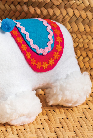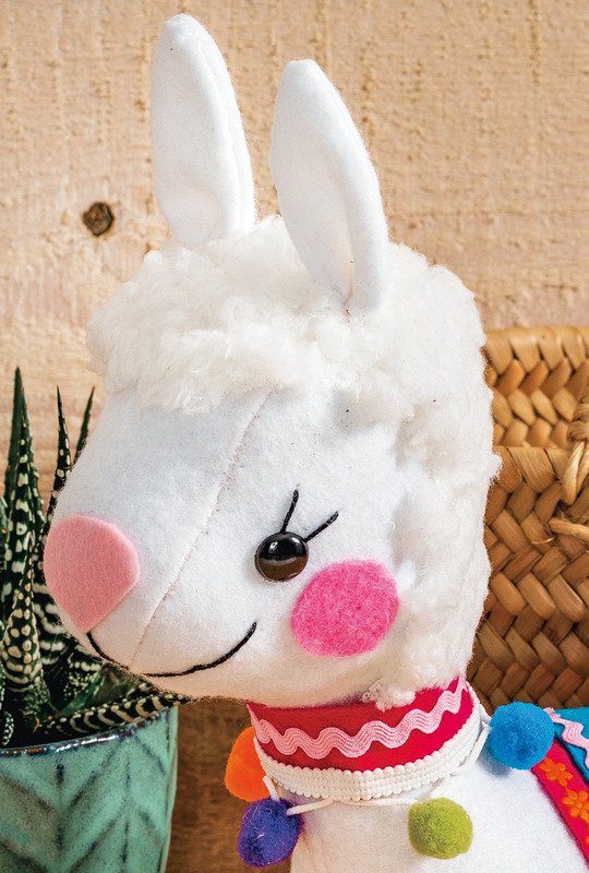 Ob zum Spielen, zum Kuscheln oder einfach nur als Deko – das bunt geschmückte Lama ist ein Symbol für gute Laune und gleichzeitig Entspanntheit. Der Lamakörper wird aus Plüschstoff genäht und anschließend großzügig mit Füllwatte ausgestopft. Das Halsband für das kleine Lama entsteht aus einem Pompon-Band, Webband und einer rosafarbenen Zackenlitze. Der große und der kleine Sattel wird mit einer Blüten-Borte bzw. einer Zackenlitze verziert. Dank der ausführlichen Nähanleitung inklusive Schnittteile ist das Nacharbeiten des niedlichen Tiers kein Problem.