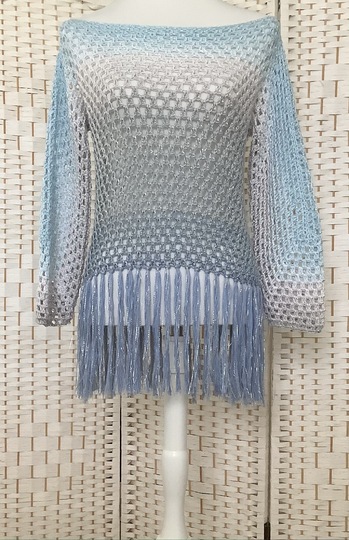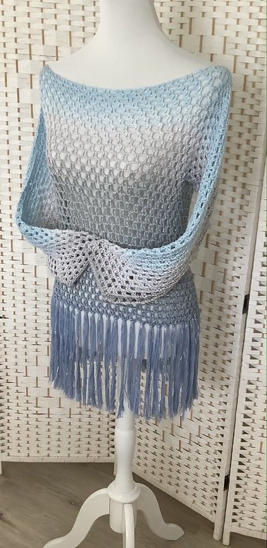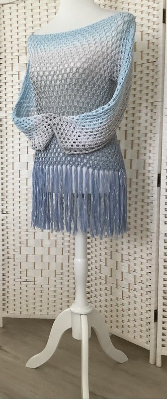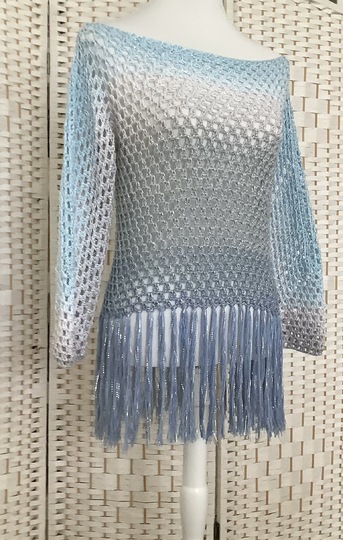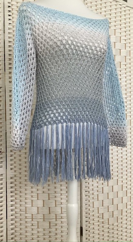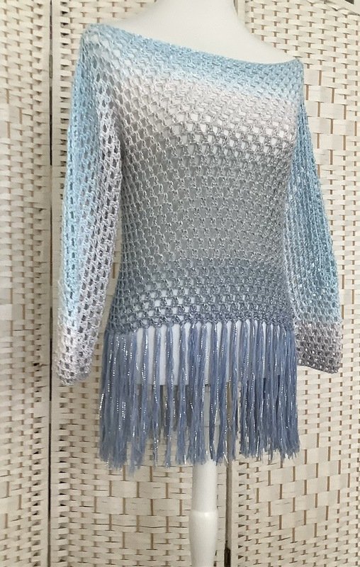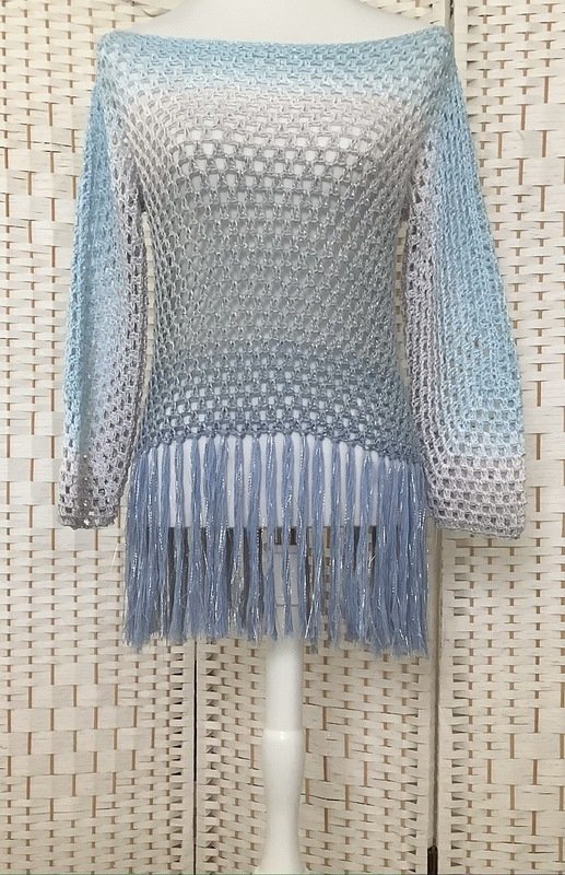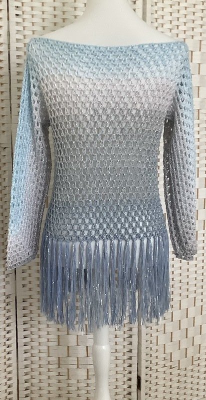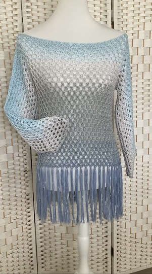 Der schöne Pulli ist an jede Größe anpassbar und für nahezu jedes Garn geeignet. Man kann ihn natürlich auch ohne Fransen arbeiten.
