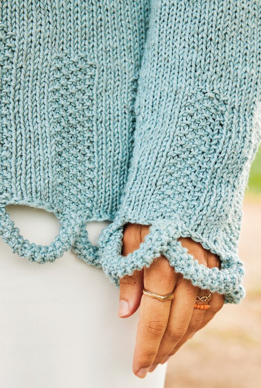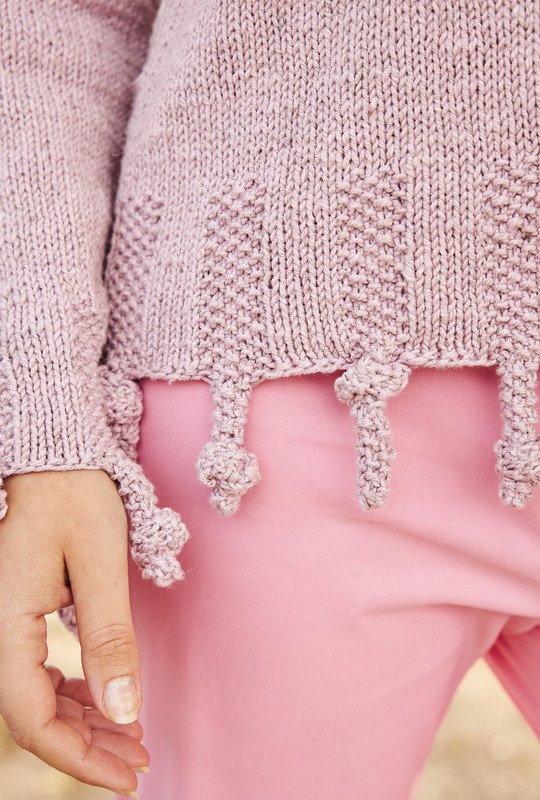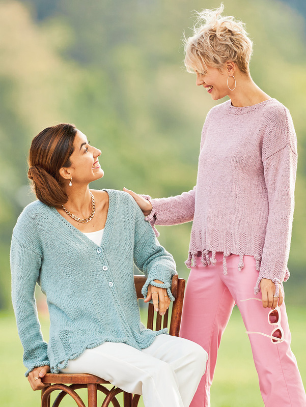 Hier haben sowohl Jacke als auch Pullover das besondere Extra, nämlich ganz besondere Abschlüsse: die resedafarbene Jacke einen mit Perlmuster-Strickschnüren und der Pullover in einem Orchideen-Farbton einen mit Strickschnüren. Sowohl die Jacke mit V-Ausschnitt als auch der Pullover mit Rundhalsausschnitt bieten durch die langen Ärmel auch in der kälteren Jahreszeit viel Tragekomfort. Gestrickt wird im kleinen Perlmuster sowie glatt rechts mit Rundstricknadeln 4 bzw. 4,5. Mit dieser ausführlicher Strickanleitung inkl. Schnittmuster kannst du die Jacke in den Größen 36/38, 40/42 sowie 46/48 und den Pullover in den Größen 36/38, 40/42 sowie 44/46 stricken.