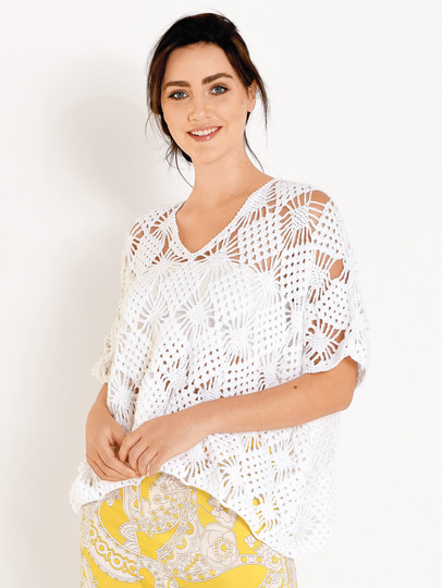 Was für ein Statement! In strahlendem Weiß, einer Farbe die einfach sein muss. Weit und sehr lässig kommt dieser Pulli daher. Ganz gerade im Schnitt und sehr weit. So fällt er weich bis zu den Ellenbogen über die Schultern. Sehr schmeichelnd: Der V-Ausschnitt, der zum Abschluss mit je einer Runde fester Maschen und Krebs-Maschen umhäkelt wird. Das Muster - ein Traum! Feste Maschen bilden Rauten, die mit Luftmaschen an Stäbchengruppen grenzen. So ergibt sich das luftige, grafische Muster. Kein Hexenwerk und leicht zu arbeiten. Das Garn hat einen wunderbar weichen Fall, ohne formlos zu wirken. Gehäkelt wird mit Nadel Nr 4,5 und Garn von ggh. Die Anleitung gilt für die Größen 36, 38, 40, 42, 44 und 46.